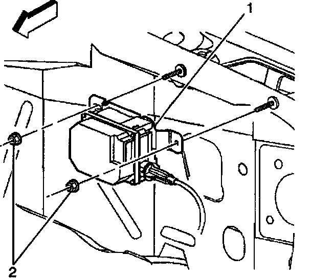 9. Remove the retaining nuts (2) and the cruise control module (1) from the mounting studs.