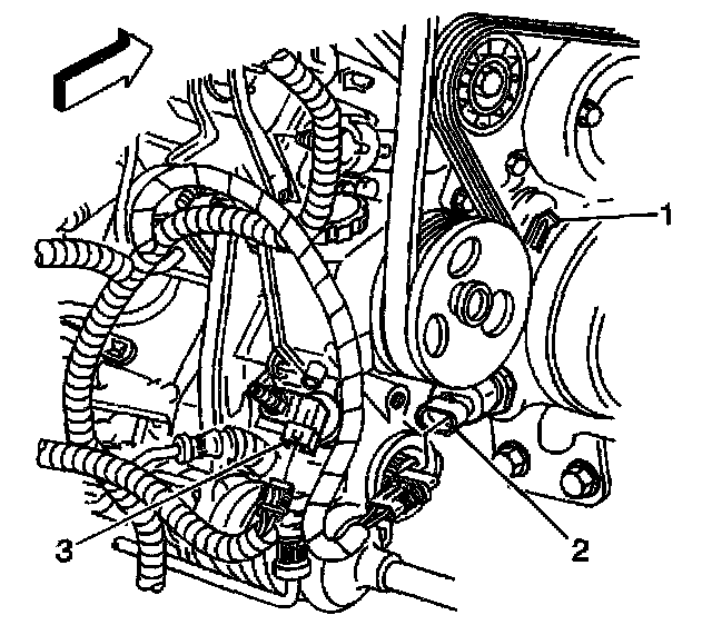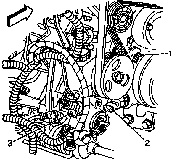 45. Remove the heater hoses from the drive belt tensioner fittings.