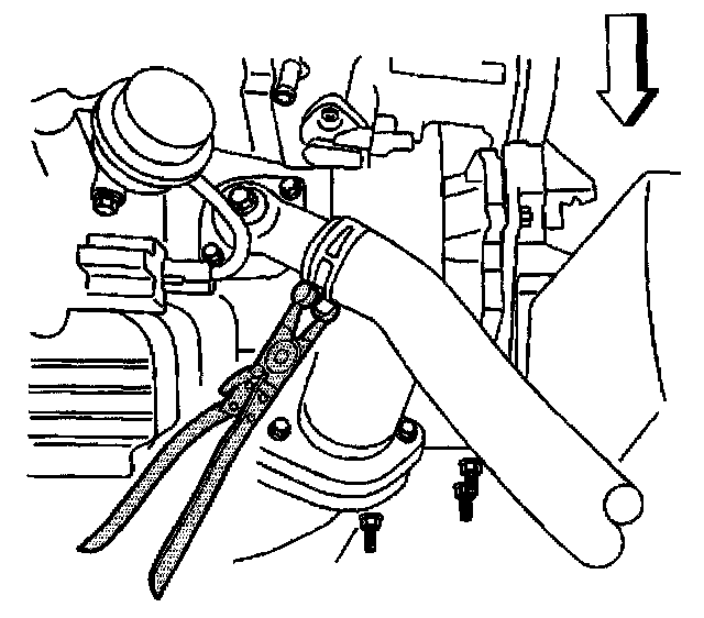 44. Position the J 38185 to the clamp in order to remove the radiator outlet hose from the thermostat housing.