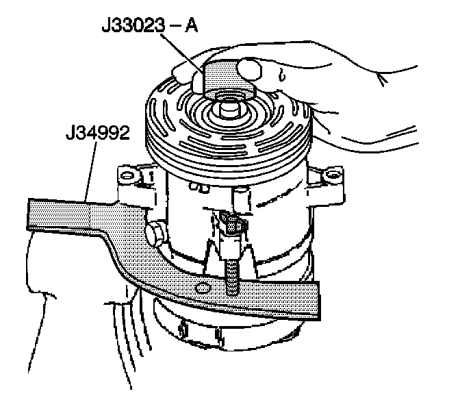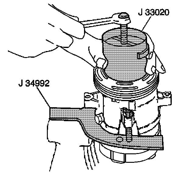 6. Hold the J 33020 in place. Tighten the puller screw against the puller guide in order to remove the puller rotor and bearing assembly.