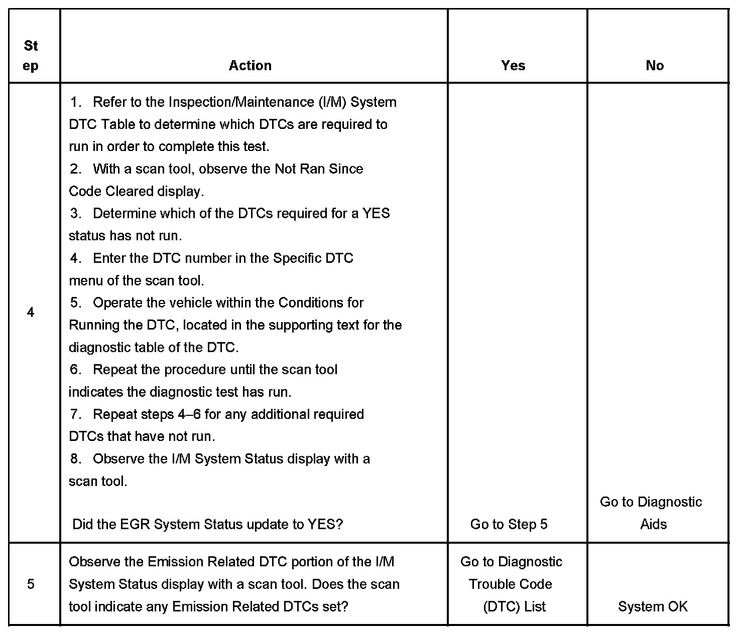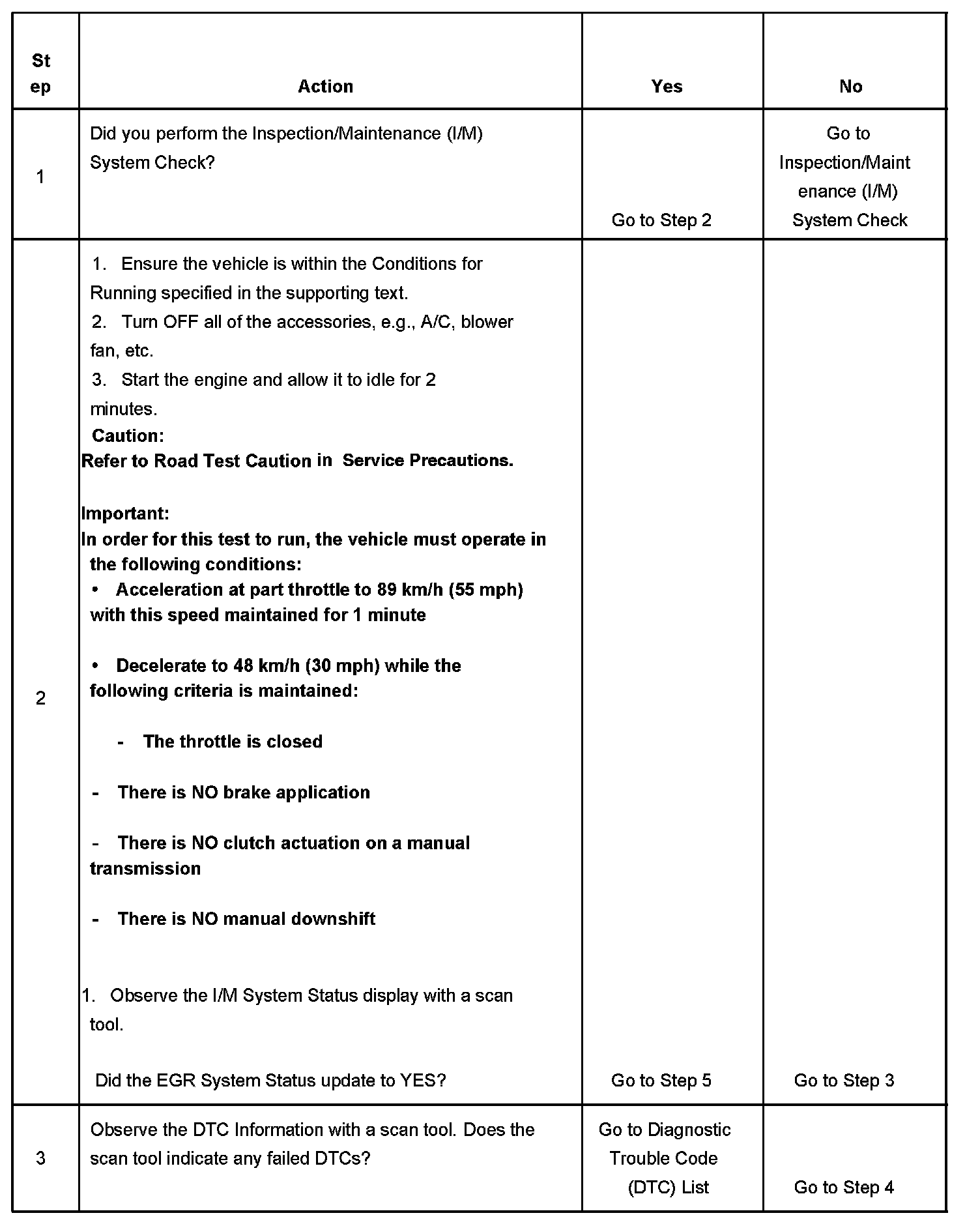 The purpose of this test is to satisfy the enable criteria necessary to execute inspection/maintenance (I/M) readiness diagnostics for the exhaust gas recirculation (EGR) system. The test may be used to set the I/M System Status indicators to YES. The I/M System Status display on the scan tool provides an indication of whether the control module has completed the required tests. The I/M System Status does not indicate that the tests have passed or failed. When all of the diagnostics for a specific system have run and passed, the I/M System Status will update to YES. If a test for a specific system has failed, the I/M System Status will update to YES, indicating a determination was made even if all of the other tests for that system have not run.