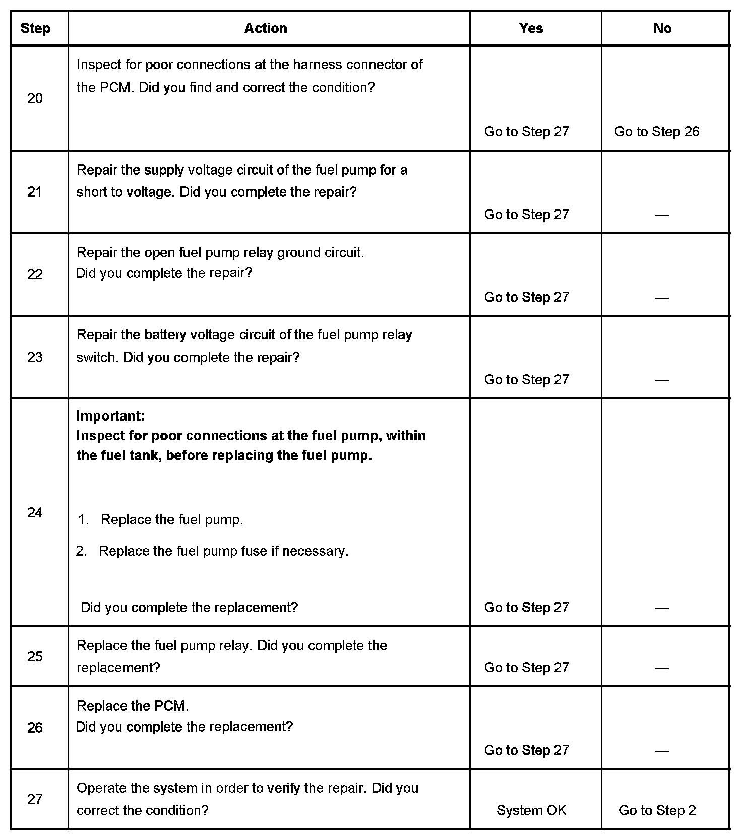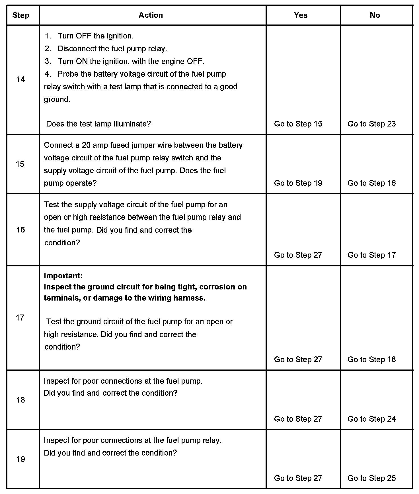 5. This step tests for an open in the ground circuit to the fuel pump relay.