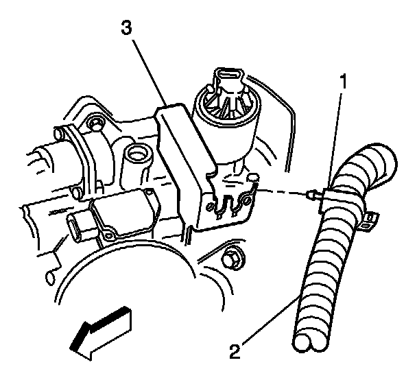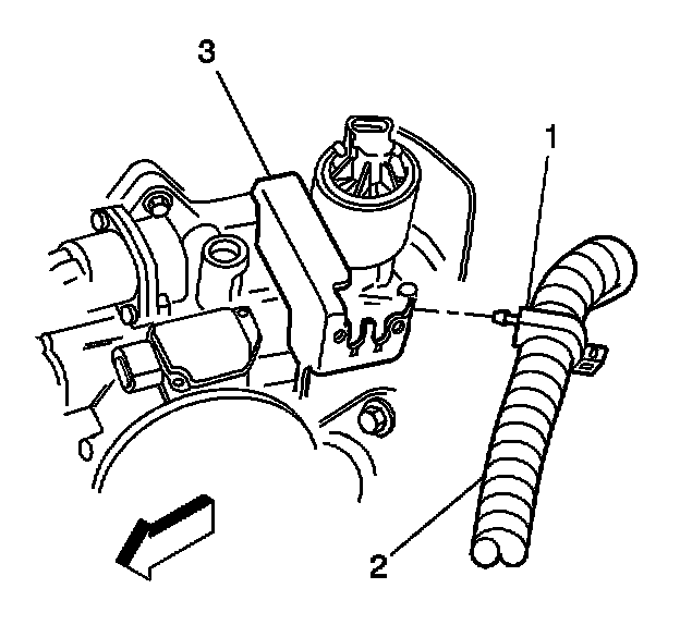 6. Remove the wiring harness clip (1) from bracket (3) if necessary (VIN K only).
