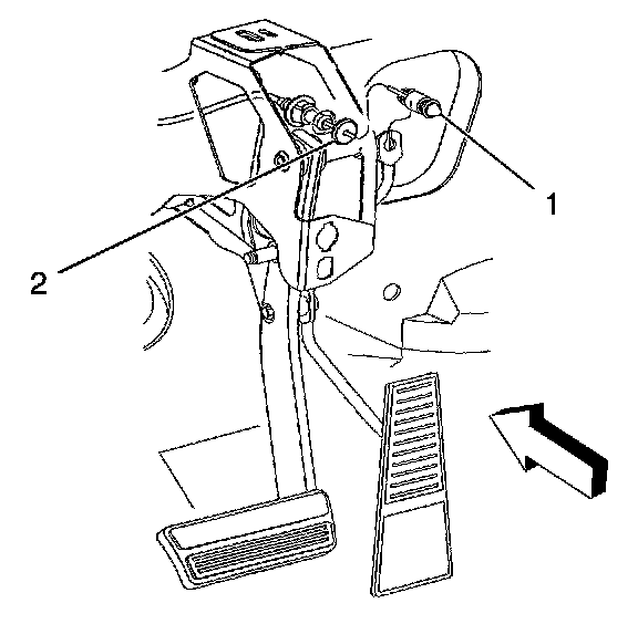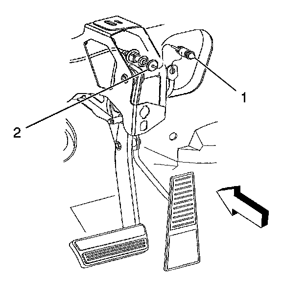 3. Install the accelerator control cable (1) through the slot in the accelerator pedal lever (2).