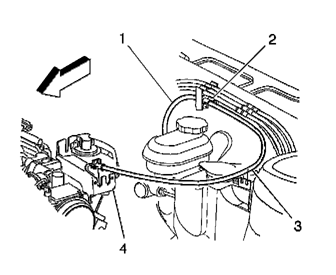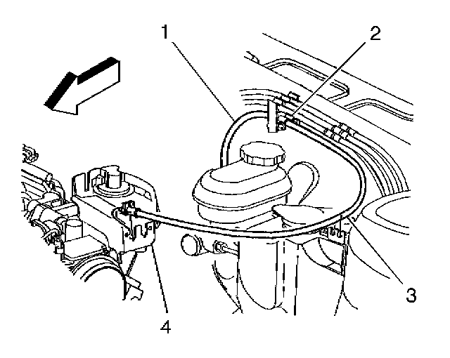 5. Remove the accelerator control cable (1) from the right slot on top of washer bottle (3).