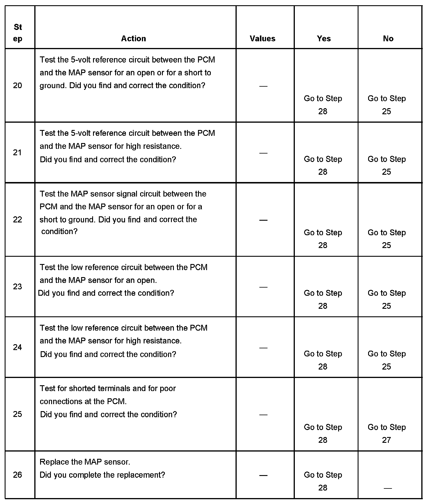 The manifold absolute pressure (MAP) sensor responds to changes in intake manifold pressure which gives an indication of the engine load. The MAP sensor has a 5-volt reference circuit, a low reference circuit, and a signal circuit. The powertrain control module (PCM) supplies 5 volts to the MAP sensor on the 5-volt reference circuit and provides a ground on the low reference circuit. The MAP sensor provides a signal to the PCM on the MAP sensor signal circuit, which is relative to the pressure changes in the manifold. With low MAP, such as during idle or deceleration, the PCM should detect a low MAP sensor signal voltage. With high MAP, such as ignition ON, engine OFF or wide open throttle (WOT), the PCM should detect a high MAP sensor signal voltage. The MAP sensor is also used in order to calculate the barometric pressure (BARO) when the ignition switch is turned ON, with the engine OFF. The BARO reading may also be updated whenever the engine is operated at WOT. The PCM monitors the MAP sensor signal for voltage outside of the normal range. If the PCM detects a MAP sensor signal voltage that is excessively low, DTC P0107 sets. If the PCM detects a MAP sensor signal voltage that is excessively high DTC P0108 sets.