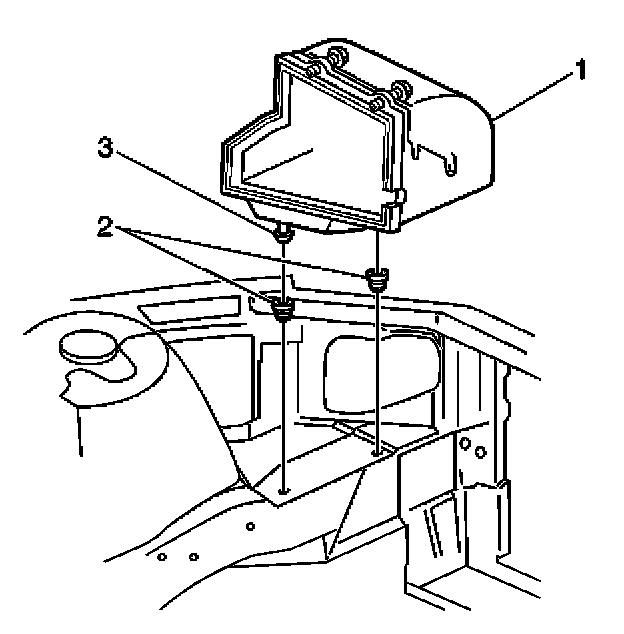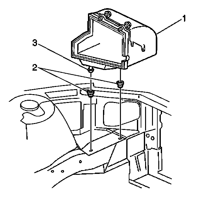 1. Install the lower air cleaner assembly (1) into the 2 rubber grommets (2) in the engine compartment.