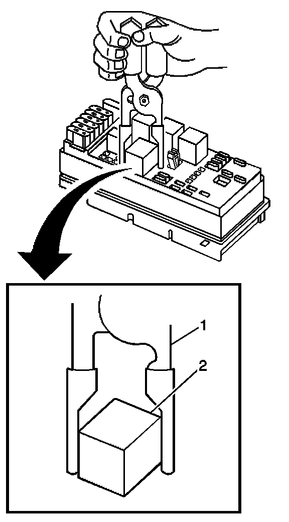 3. Using the J 43244 (1) position the tool on opposing corners of the relay (2).