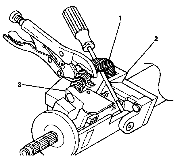5. Remove the tilt spring (1) from the steering column support assembly (2) and from the steering column tilt head assembly (3) by using the following procedure:
