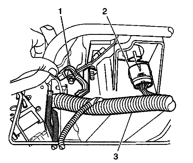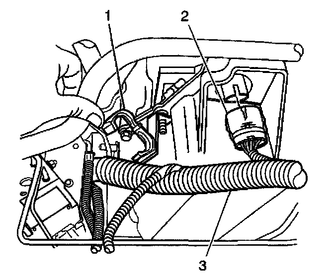 7. Remove the wiring harness (3) from the wiring harness retainer (1) on the transaxle.