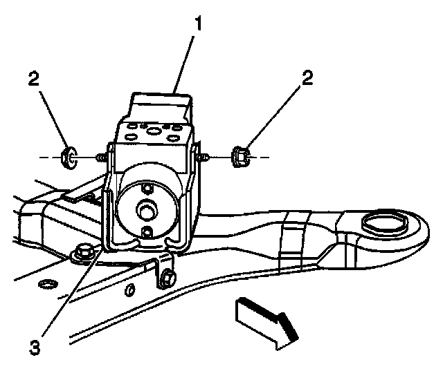 21. Loosen the two mounting nuts (2) in order to allow removal of the brake pressure modulator valve (1) from the bracket (3).