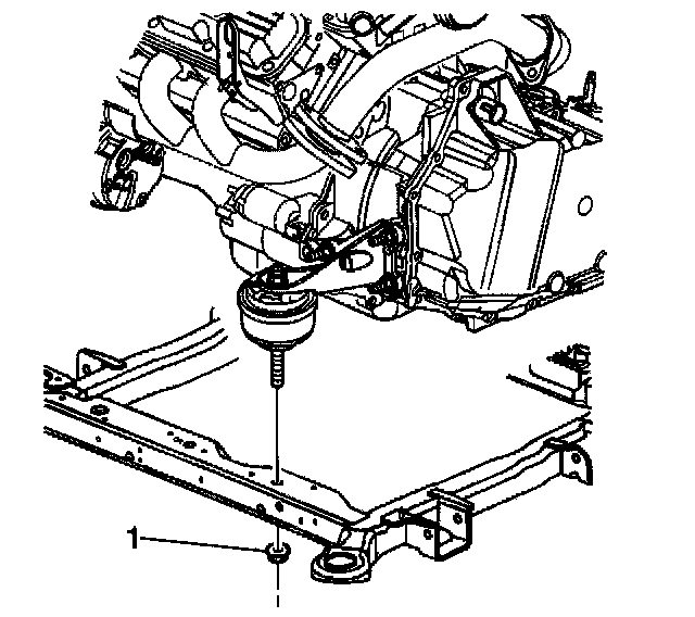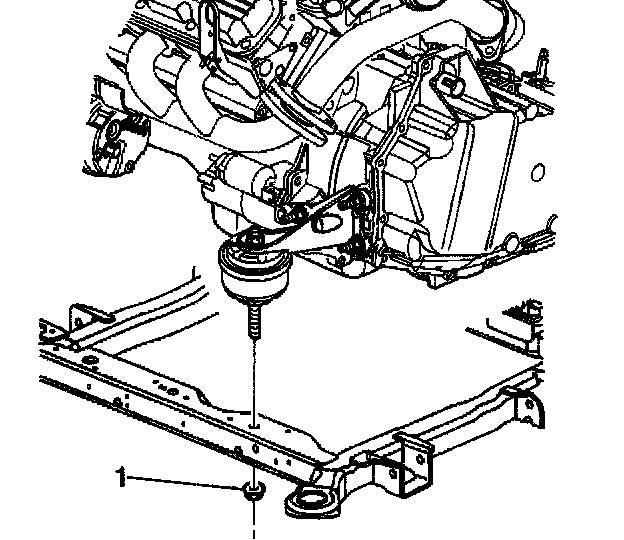 3. Install the nut (1) securing the front transmission mount to the frame.