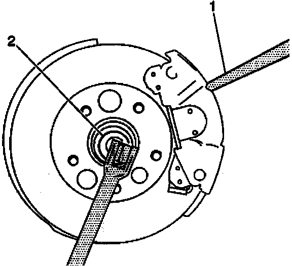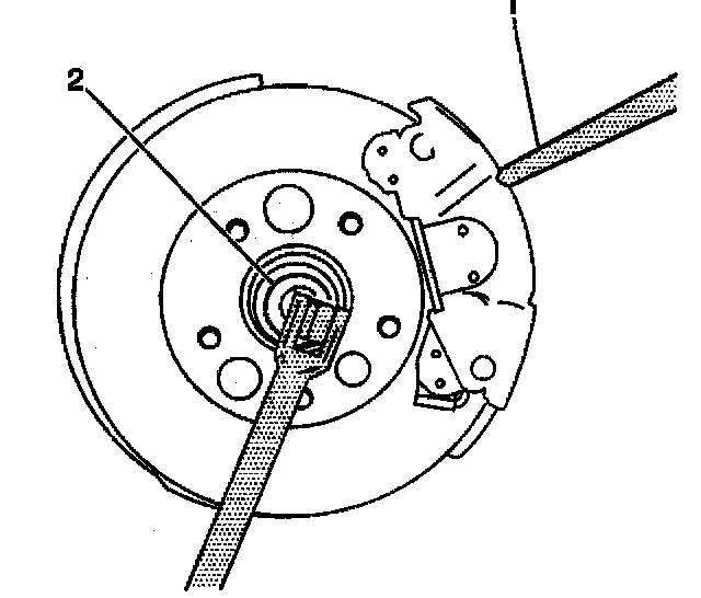 4. Insert a drift or punch (1) into the brake rotor and against the brake caliper in order to prevent the wheel hub and bearing from fuming.
