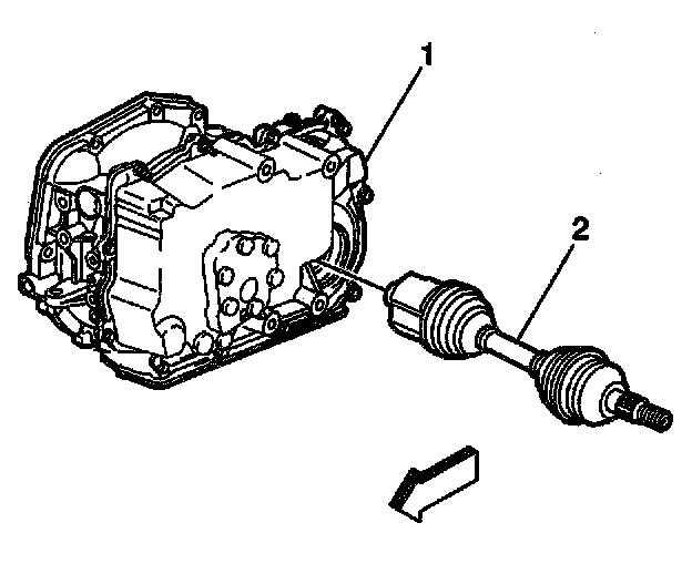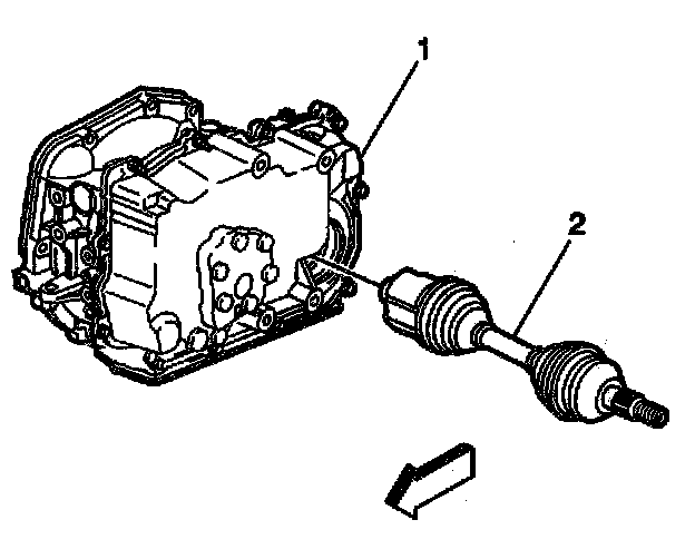 12. Using the J2619-01, the J29794, and the J33008-A, disengage the wheel drive shaft (2) from the transaxle (1).