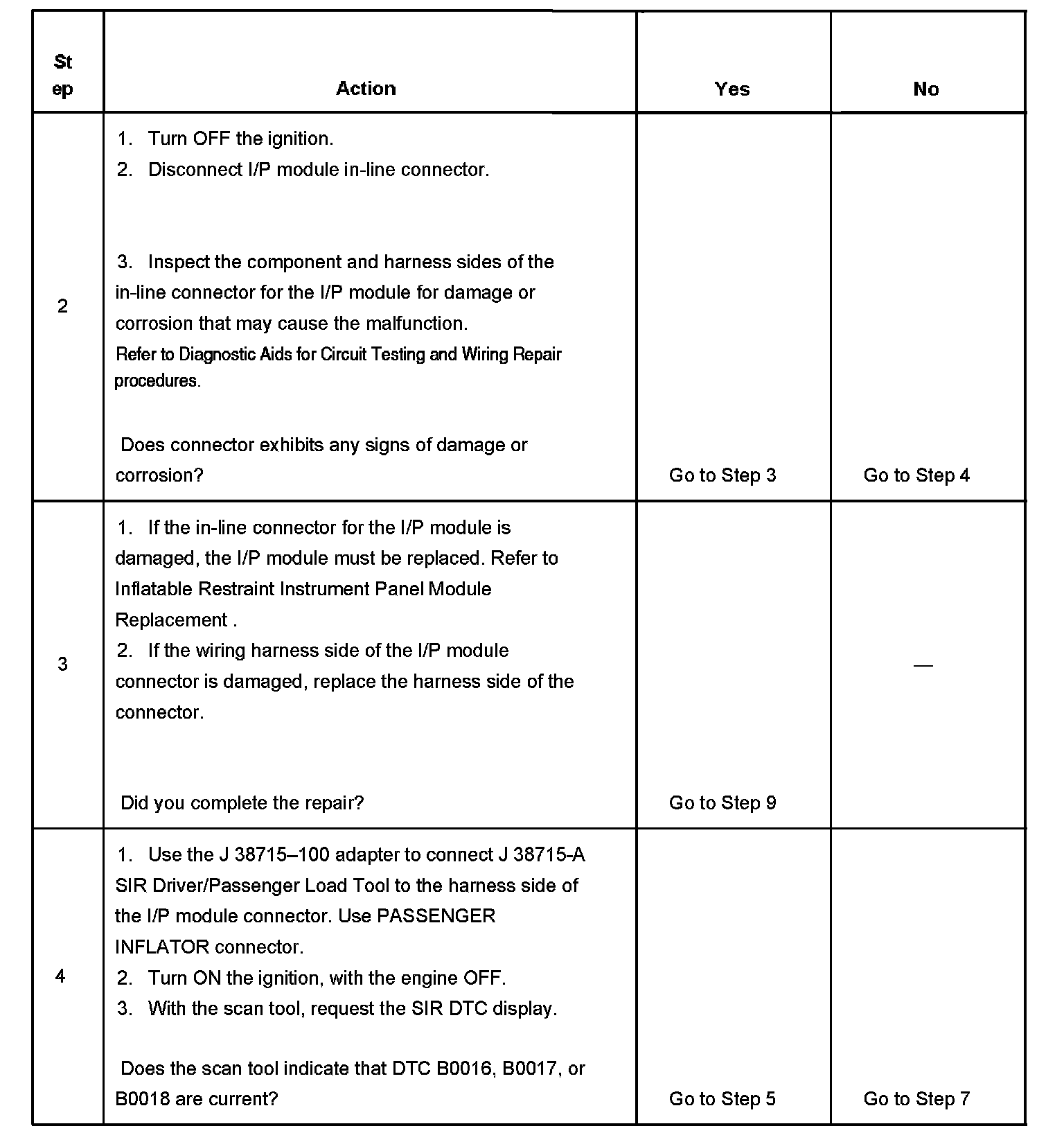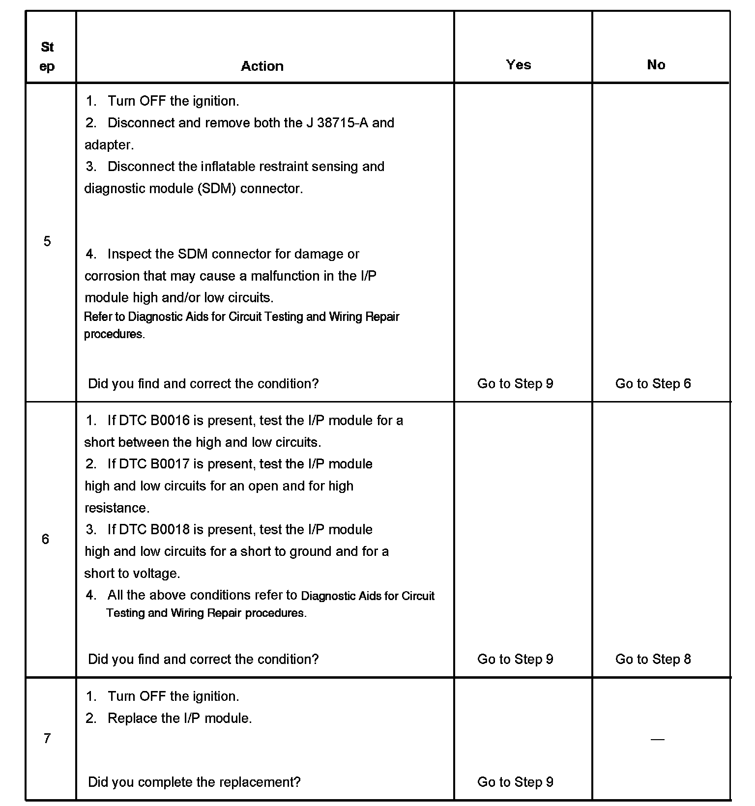 6. Tests to see what DTCs are present. If DTC B0016 is present, test the I/P module for a short between high and low circuits. If DTC B0017 is present, test the IP module high and low circuits for an open and for high resistance. If DTC B0018 is present, test the I/P module high and low circuits for a short to ground and for a short to voltage.