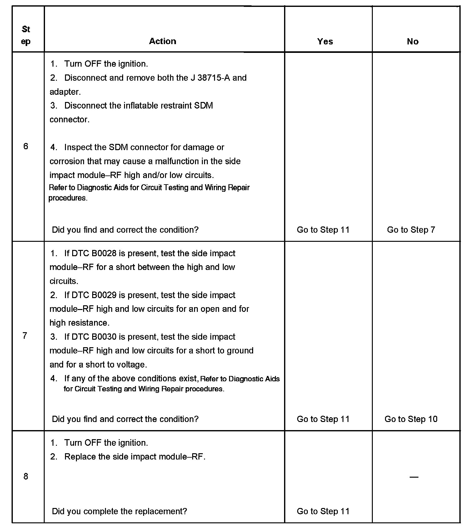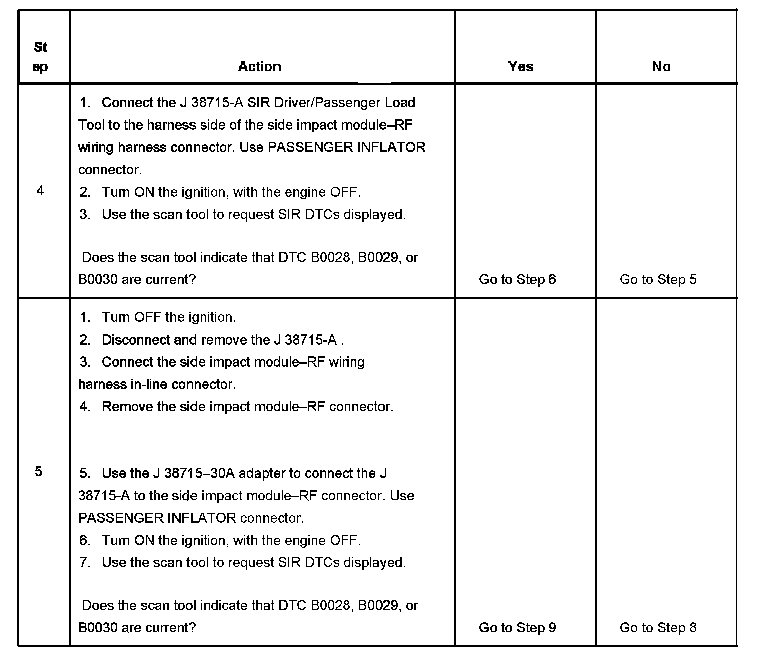 7. Determines which DTCs are present. If DTC B0028 is present, test the side-impact module-RF for a short between high circuits and low circuits. If DTCB0029 is present, test the side-impact module-RF high circuits and low circuits for an open and for high resistance. If DTC B0030 is present, test the side-impact module-RF high circuits and low circuits for a short-to-ground, or a short-to-voltage.