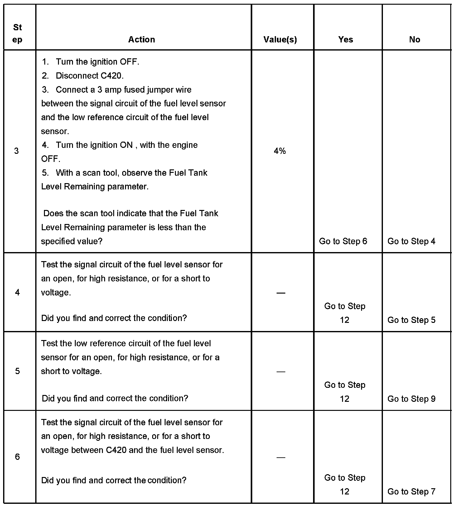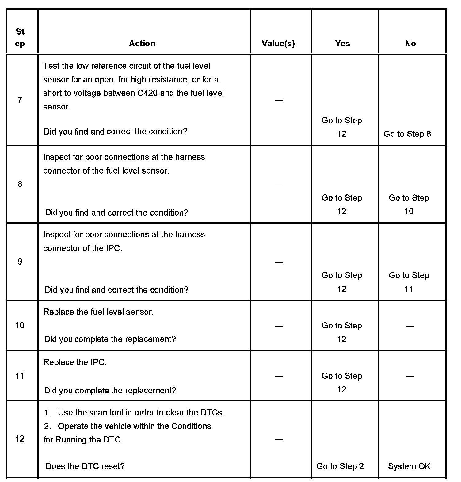 The fuel level sensor changes resistance based on fuel level. The IPC monitors the signal circuit of the fuel level sensor in order to determine fuel level. When the fuel tank is full, the sensor resistance is high and the IPC senses a high signal voltage. When the fuel tank is empty, the sensor resistance is low and the IPC senses a low signal voltage. The IPC uses the signal circuit of the fuel level sensor in order to determine fuel gage position. The IPC sends the fuel level percent via the class 2 serial data circuit to the PCM for misfire and EVAP diagnostics.