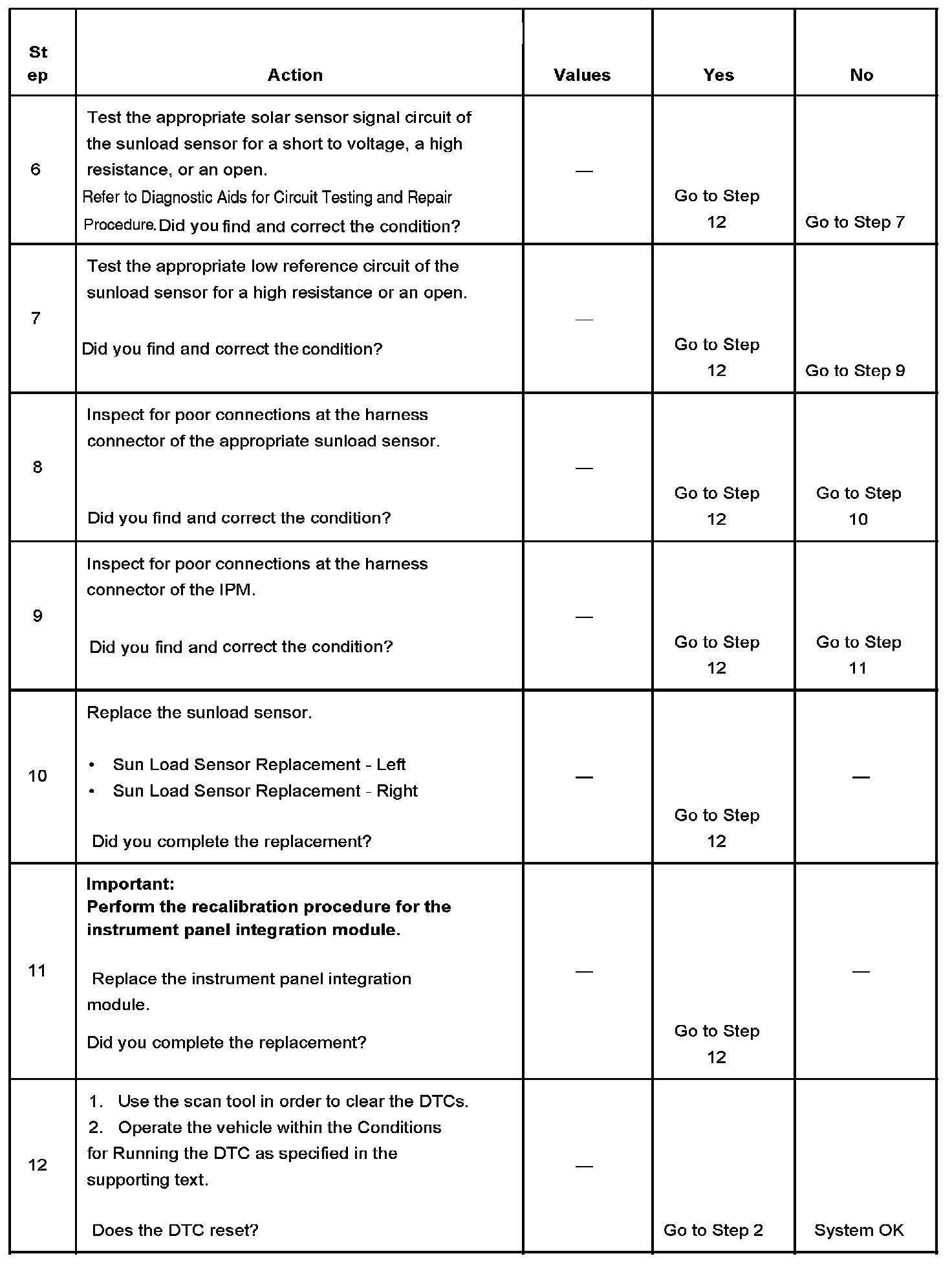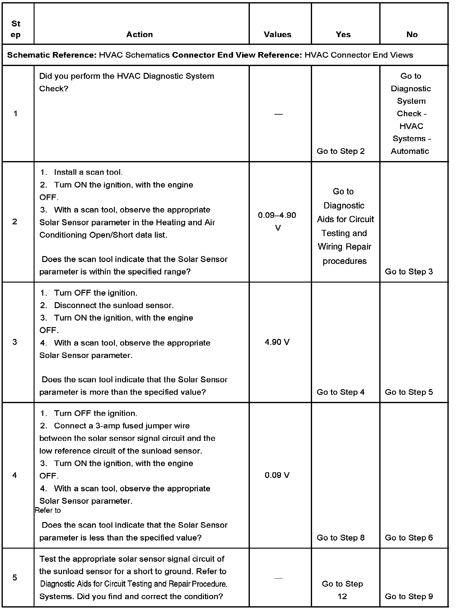 The IPM detects the sunload sensor signal circuit is less than 0.09 volt (5 counts) or more than 4.90 volts (250 counts).
