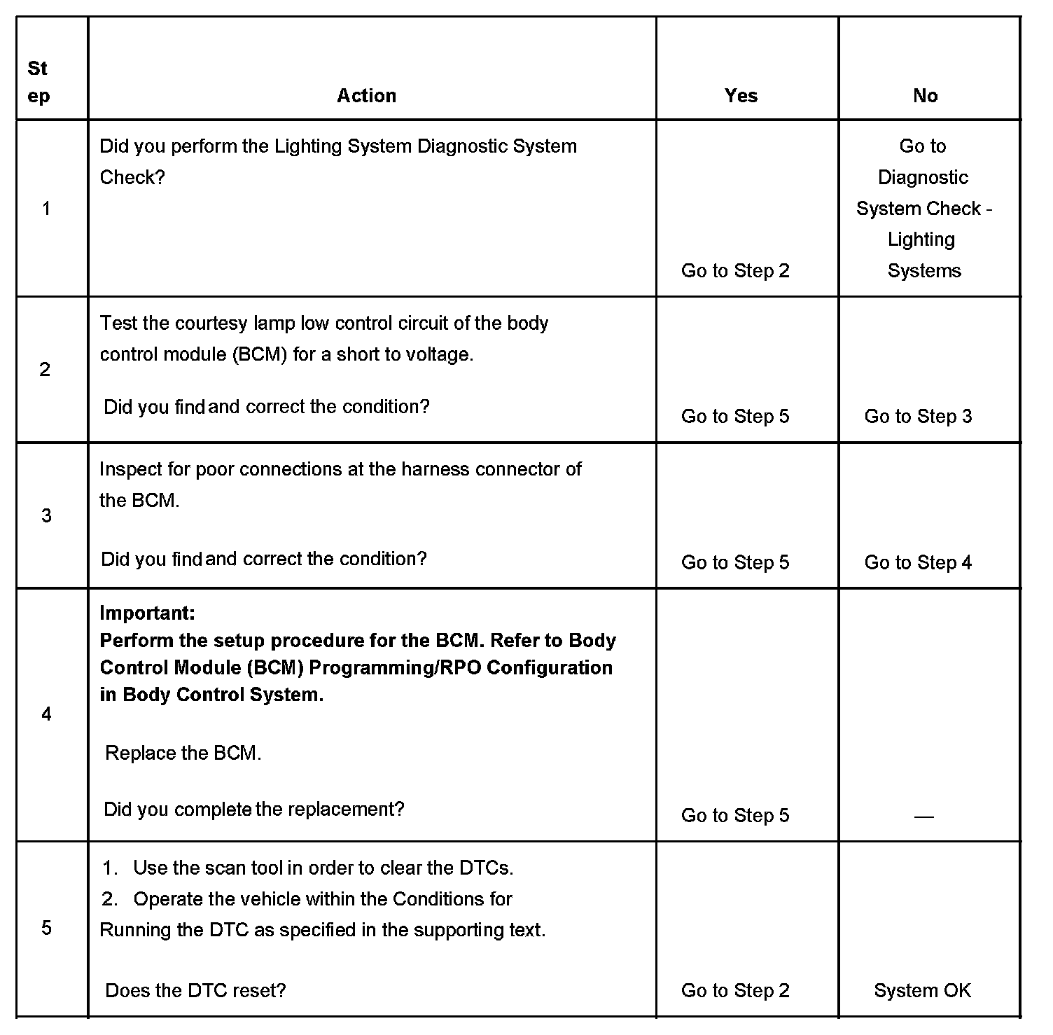 - A short to voltage is no longer detected by the BCM in the courtesy lamp low control circuit.