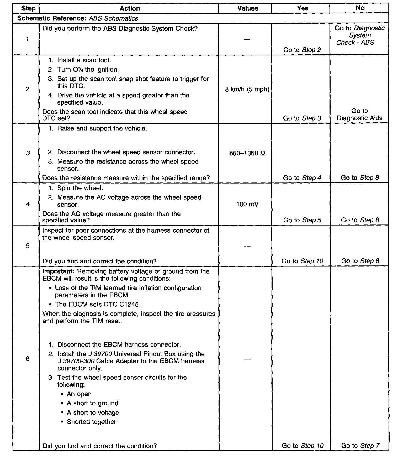 ^ An open - the wheel speed sensor signal circuit voltage is greater than 4.25 volts and wheel speed sensor return circuit voltage is less than 0.75 volts.