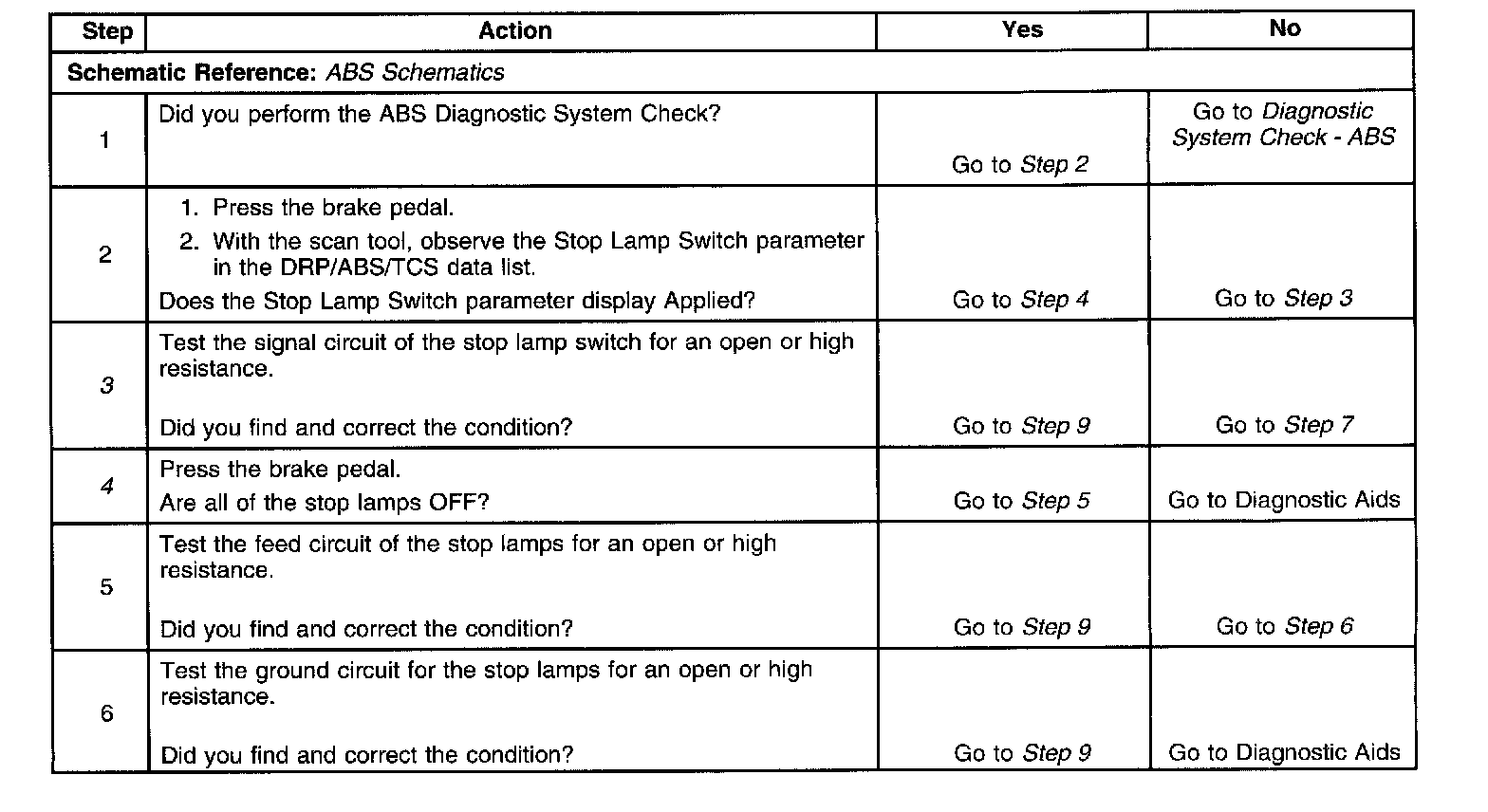 4. The EBCM sources 5 volts on the stop lamp switch signal circuit. This small voltage has a ground path through the stop lamp bulbs. This DTC sets if the path to ground is open.