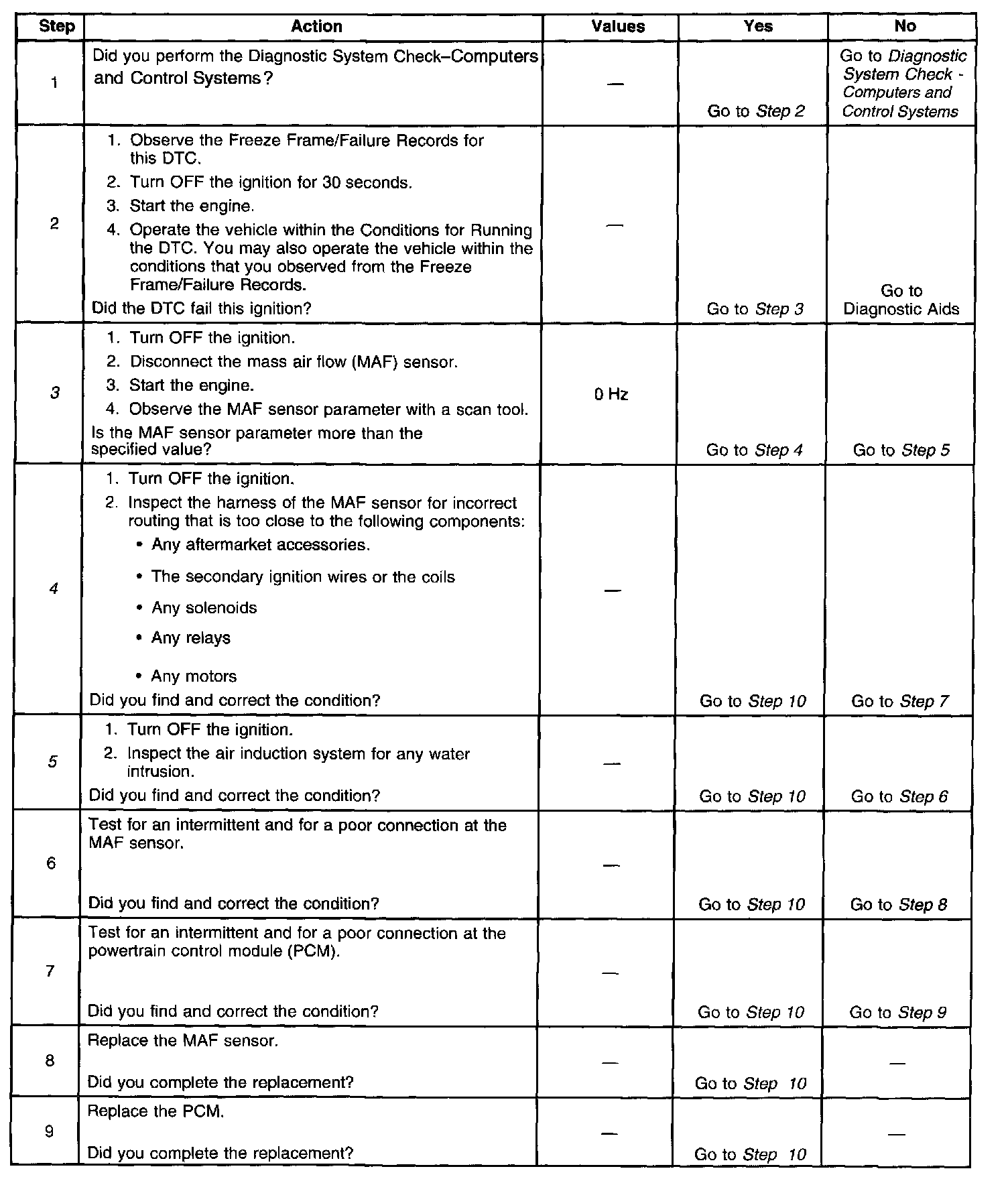 3. This step tests for Electromagnetic Interference (EMI) on the signal circuit of the MAF sensor. A frequency reading with the MAF sensor disconnected may indicate an EMI related fault or a poor connection at the PCM. Disconnecting the MAF sensor may set additional related DTCs.