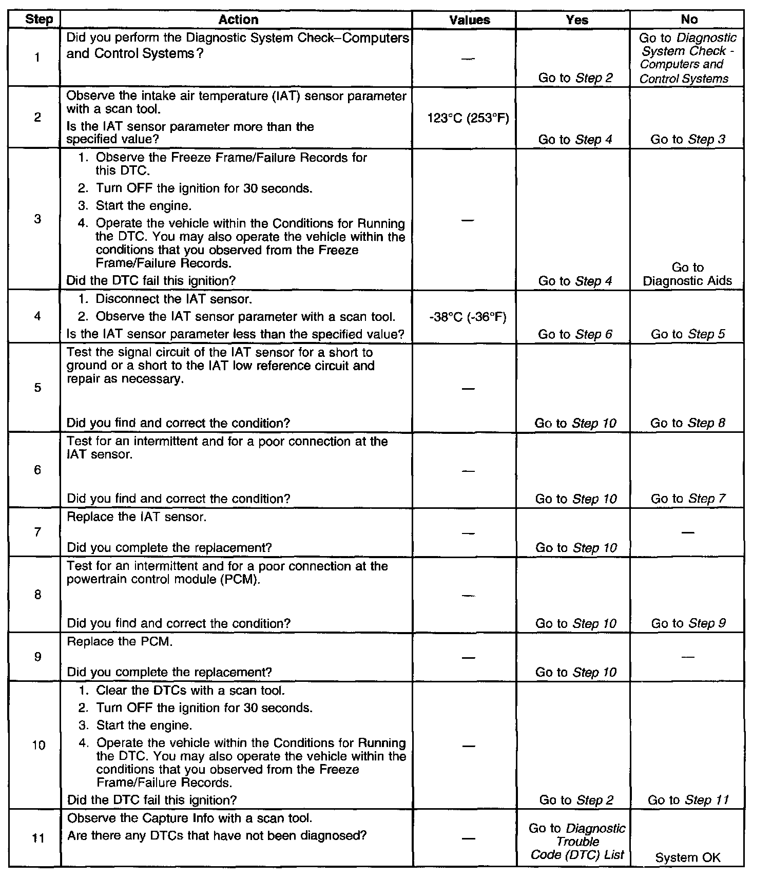 The PCM detects that the IAT sensor parameter is more than 123°C (253°F)for more than 20 seconds.