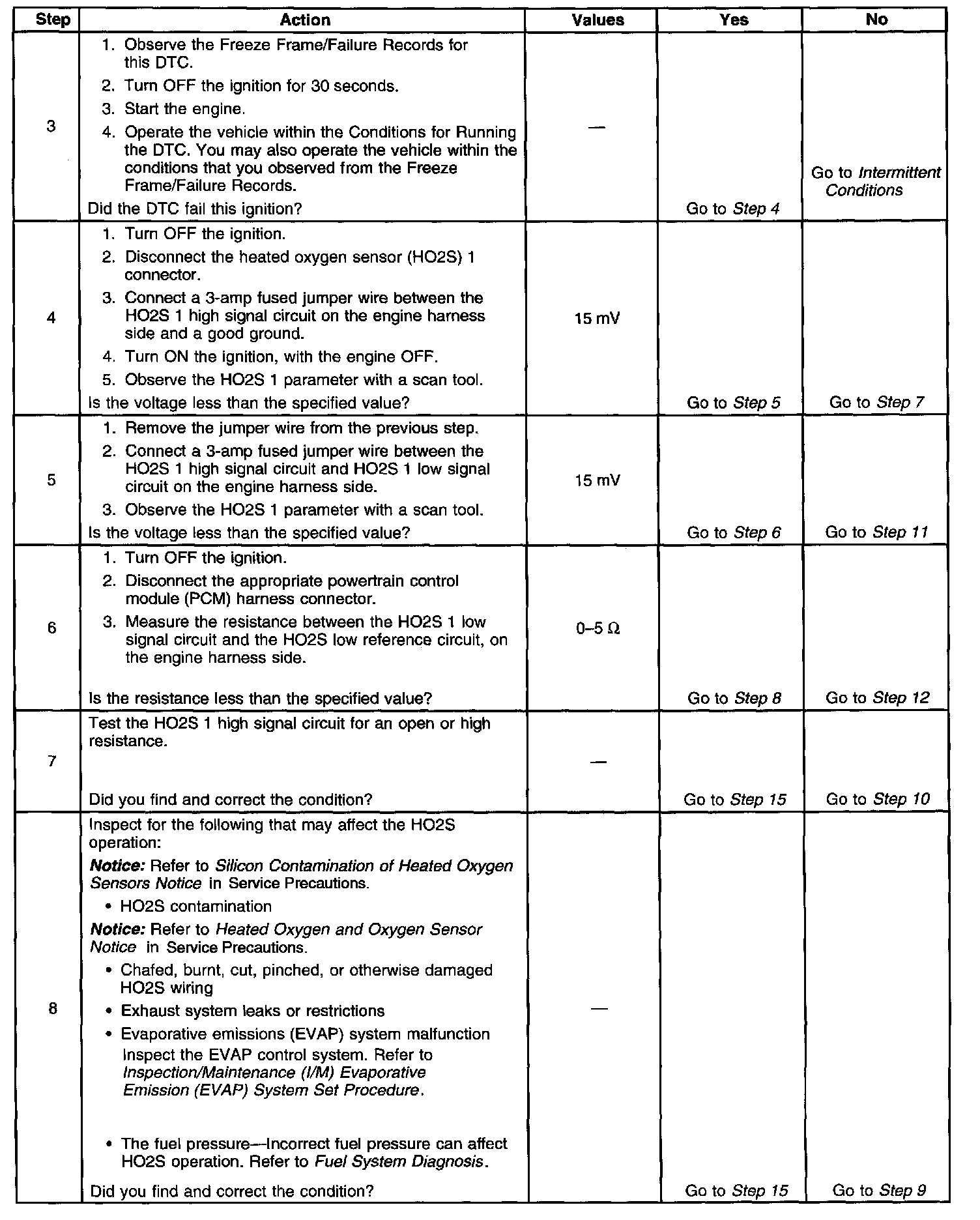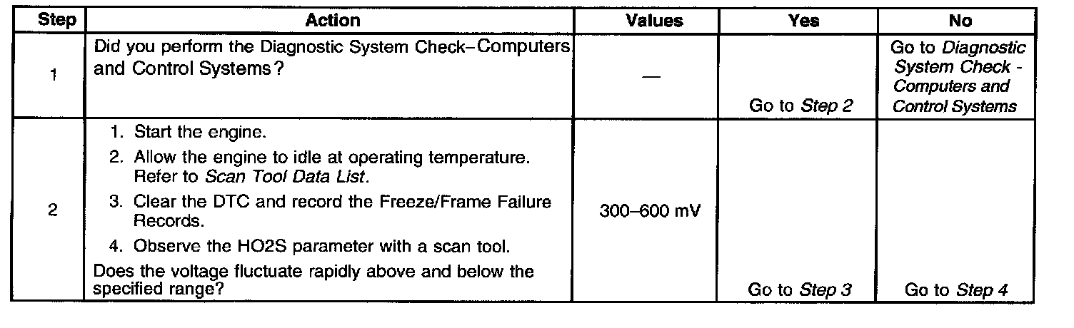 Heated oxygen sensors (HO2S) are used for fuel control and post catalyst monitoring. Each HO2S compares the oxygen content of the surrounding air with the oxygen content of the exhaust stream. When the vehicle is first started, the powertrain control module (PCM) operates in an Open Loop mode, ignoring the HO2S signal voltage when calculating the air-to-fuel ratio. The PCM supplies the HO2S with a reference, or bias, voltage of about 450 mV. The HO2S generates a voltage within a range of 0-1,000 mV that fluctuates above and below bias voltage once the sensor reaches operating temperature. A high HO2S voltage output indicates a rich fuel mixture. A low HO2S voltage output indicates a lean mixture. Heating elements inside the HO2S minimize the time required for the sensors to reach operating temperature, and provide an accurate voltage signal. If the PCM detects an active HO2S 1 signal of a lower than calibrated minimum amplitude, DTC P0130 will set.