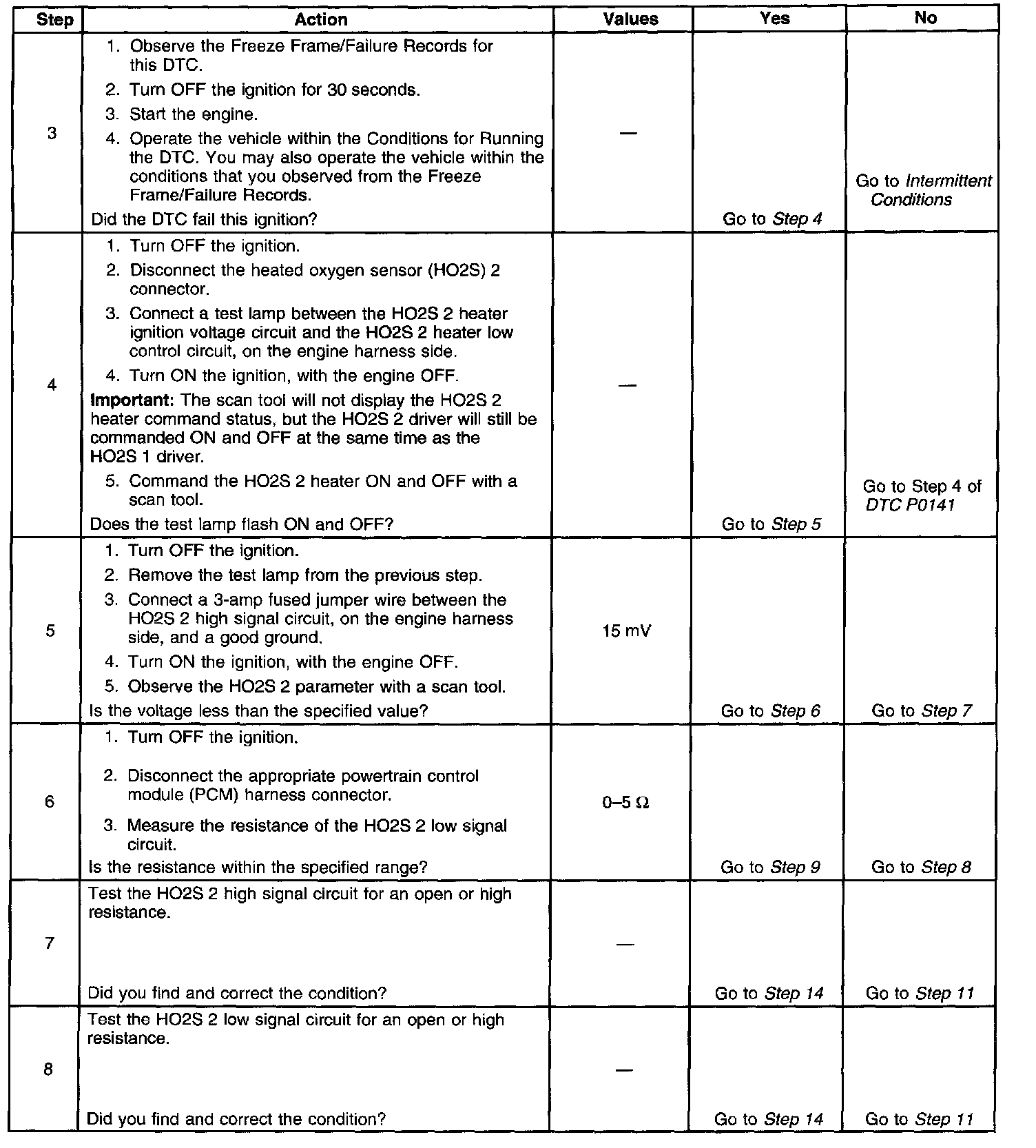 Heated oxygen sensors (HO2S) are used for fuel control and post catalyst monitoring. Each HO2S compares the oxygen content of the surrounding air with the oxygen content of the exhaust stream. When the vehicle is first started the powertrain control module (PCM) operates in an Open Loop mode, ignoring the HO2S signal voltage when calculating the air-to-fuel ratio. The PCM supplies the HO2S with a reference, or bias, voltage of about 450 mV. The HO2S generates a voltage within a range of 0-1,000 mV that fluctuates above and below bias voltage once the sensor has reached operating temperature. High HO2S voltage output indicates a rich fuel mixture; low HO2S voltage output indicates a lean mixture. Heating elements inside the HO2S minimize the time required for the sensors to reach operating temperature, and provide an accurate voltage signal. The HO2S 2 is used for post catalyst monitoring. If the PCM detects that the HO2S 2 voltage remains at or near the bias voltage, DTC P0140 will set.