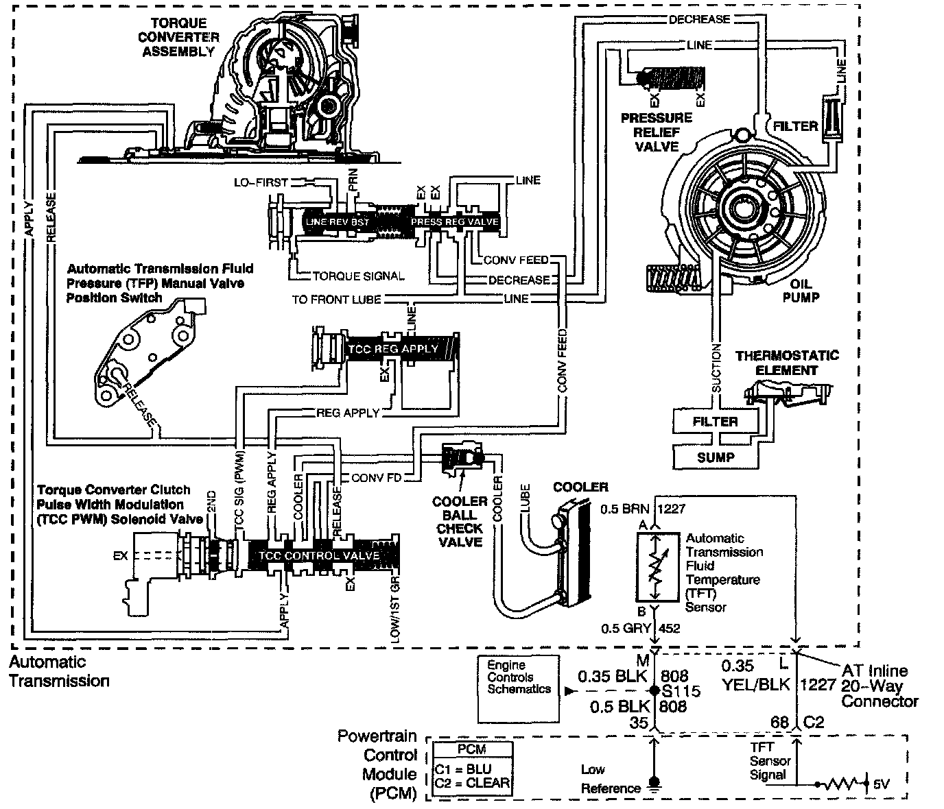 Hot fluid from the torque converter flows through the TCC control valve into the cooler lines to the oil cooler located in the vehicle radiator and auxiliary cooler, if equipped. Cool fluid then returns to lubricate the final drive assembly and other components along the output shaft.