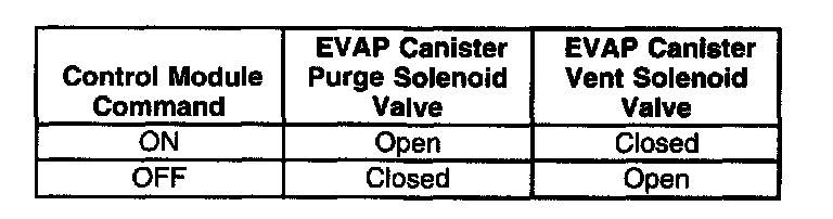 The table illustrates the relationship between the ON and OFF states, and the Open or Closed states of the EVAP canister purge and vent solenoid valves.