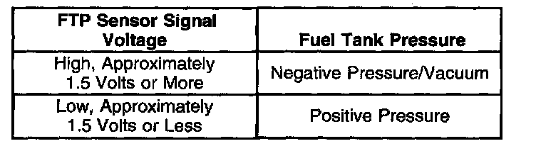 The table illustrates the relationship between FTP sensor signal voltage and the EVAP system pressure/vacuum.