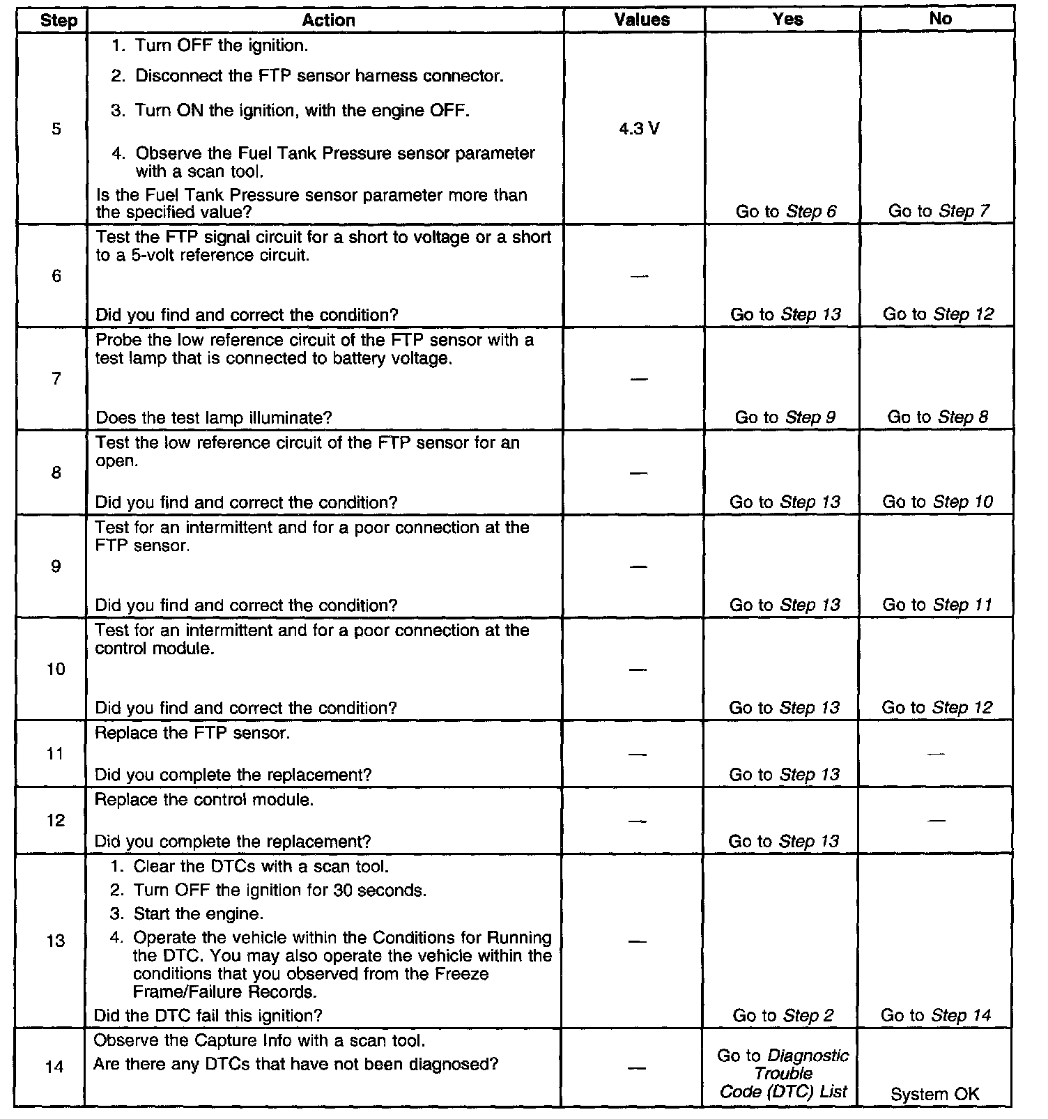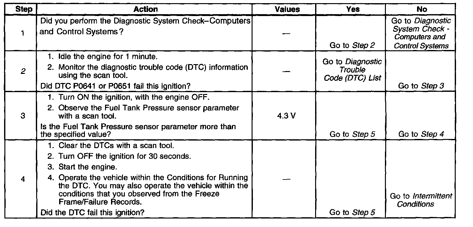 The fuel tank pressure (FTP) sensor measures the difference between the air pressure or vacuum in the evaporative emission (EVAP) system, and the outside air pressure. The control module supplies a 5-volt reference and a low reference circuit to the FTP sensor. The FTP sensor signal circuit voltage varies depending on EVAP system pressure or vacuum. If the FTP sensor signal voltage increases above a calibrated value, this DTC sets.