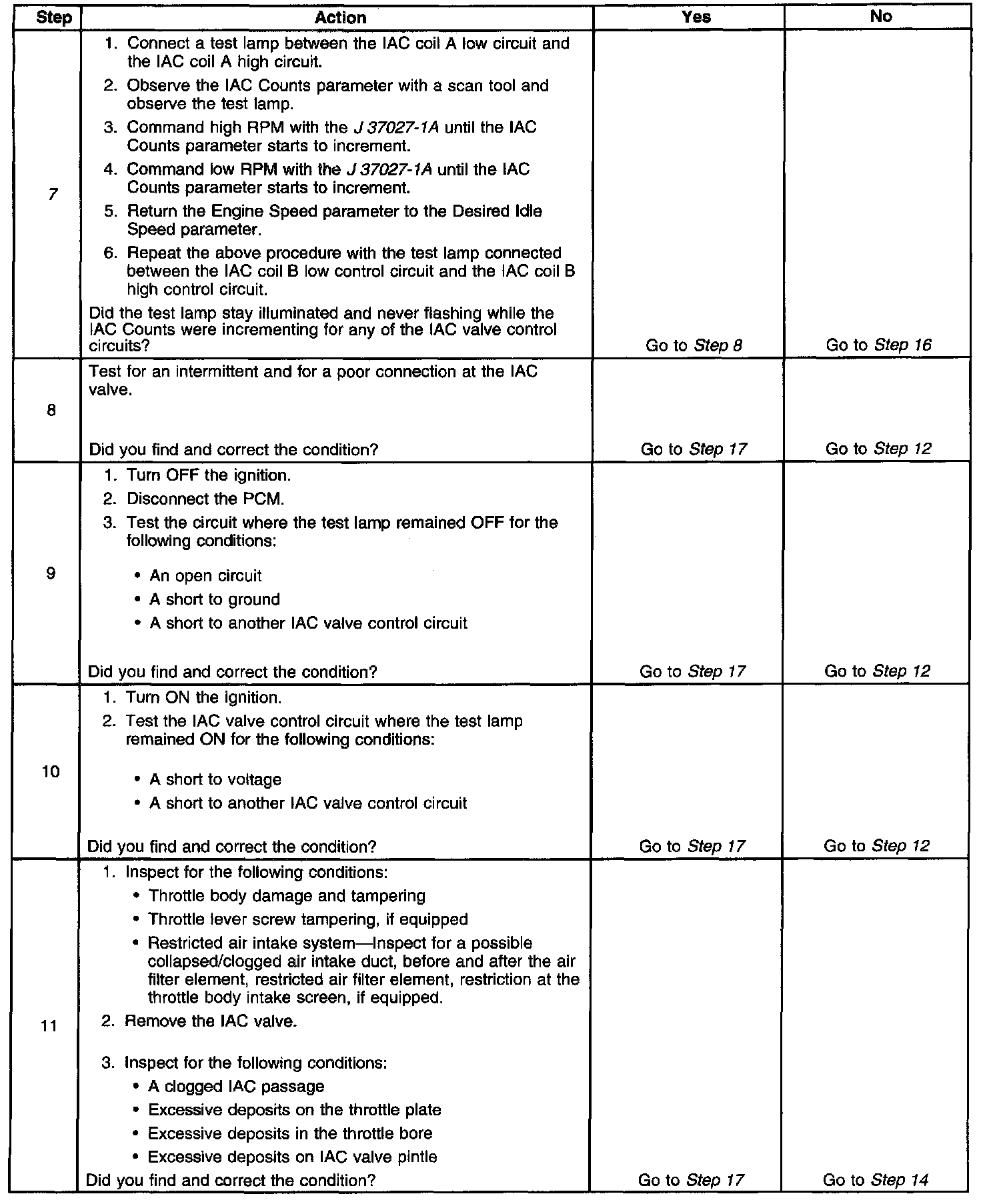 7. This test will determine the ability of the PCM to provide the IAC valve control circuits with a ground. On a normal operating system, the test lamp should not flash while the IAC Counts are incrementing.