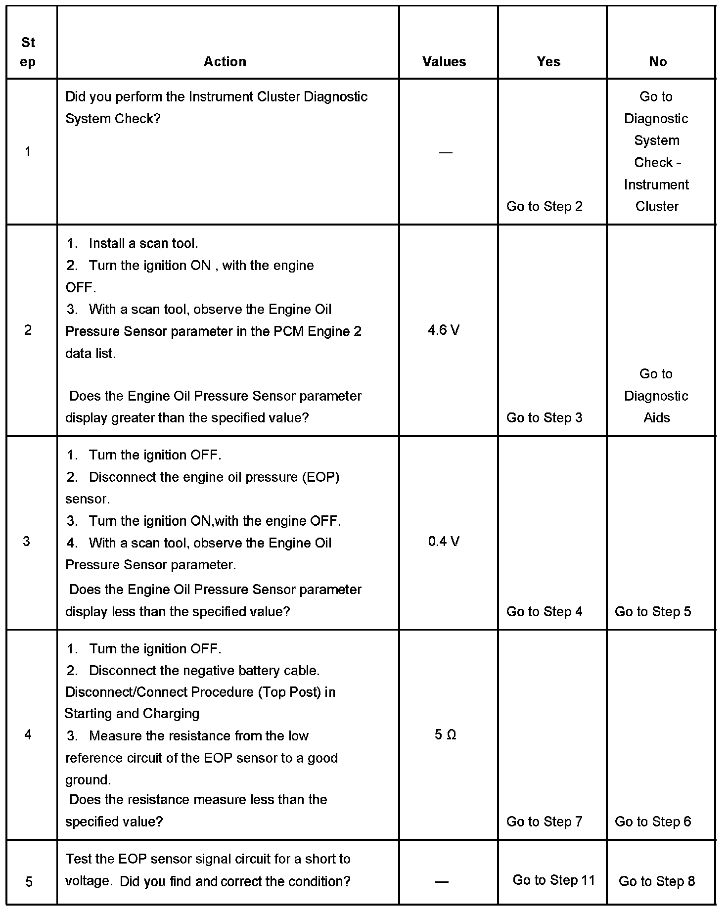 The engine oil pressure (EOP) sensor changes resistance based on engine oil pressure. The PCM monitors the signal circuit of the EOP sensor. When the oil pressure is high, the sensor resistance is high and the PCM senses a high signal voltage. When the oil pressure is low, the sensor resistance is low and the PCM senses a low signal voltage. The PCM sends the engine oil pressure information to the IPC via the class 2 serial data circuit.