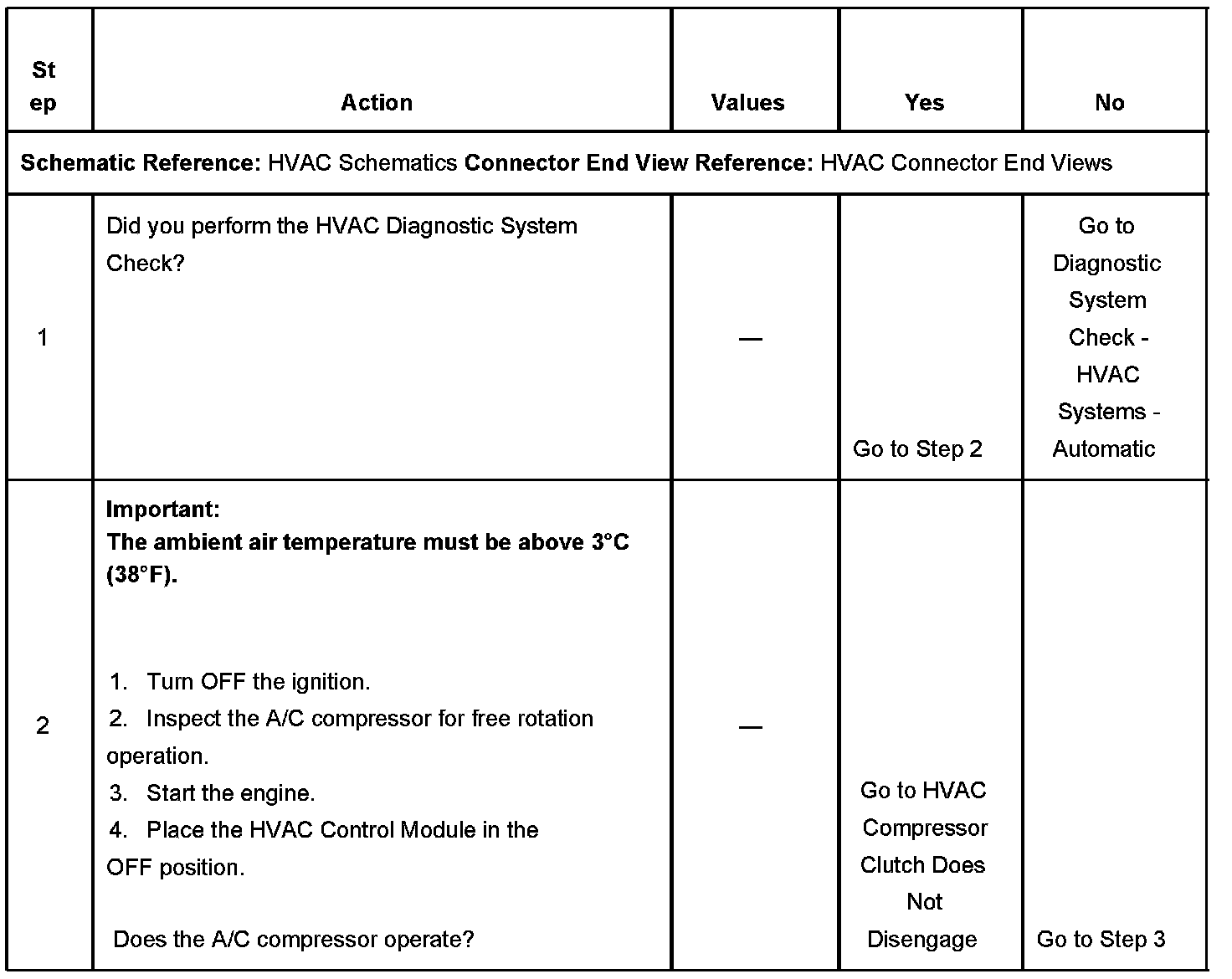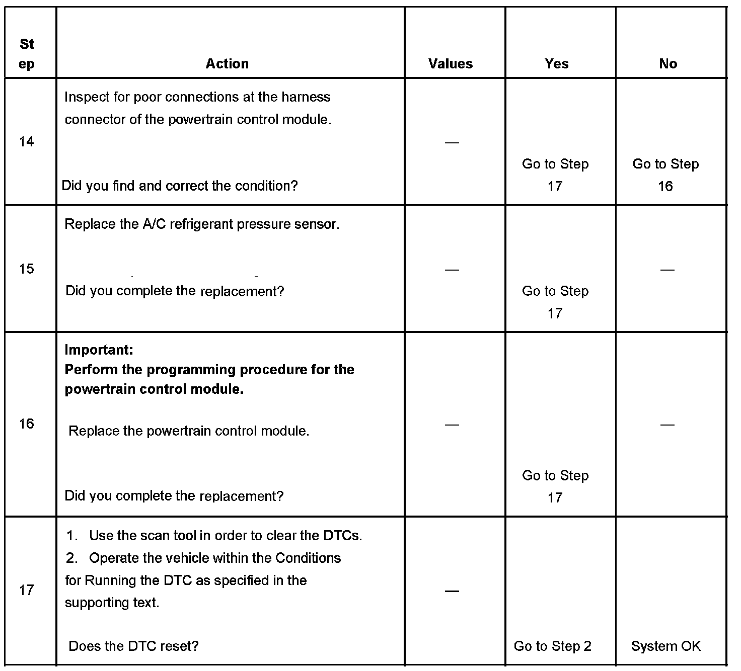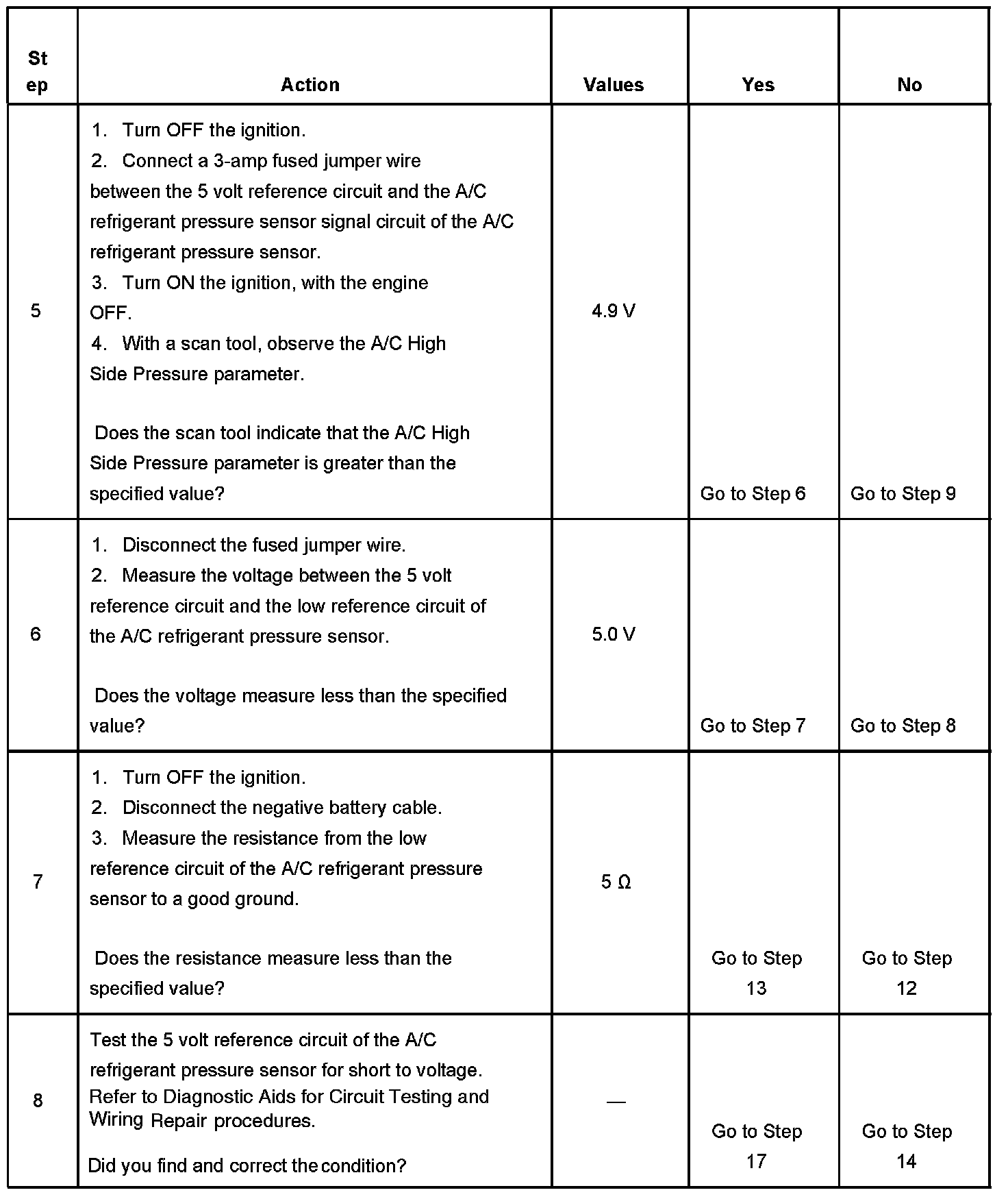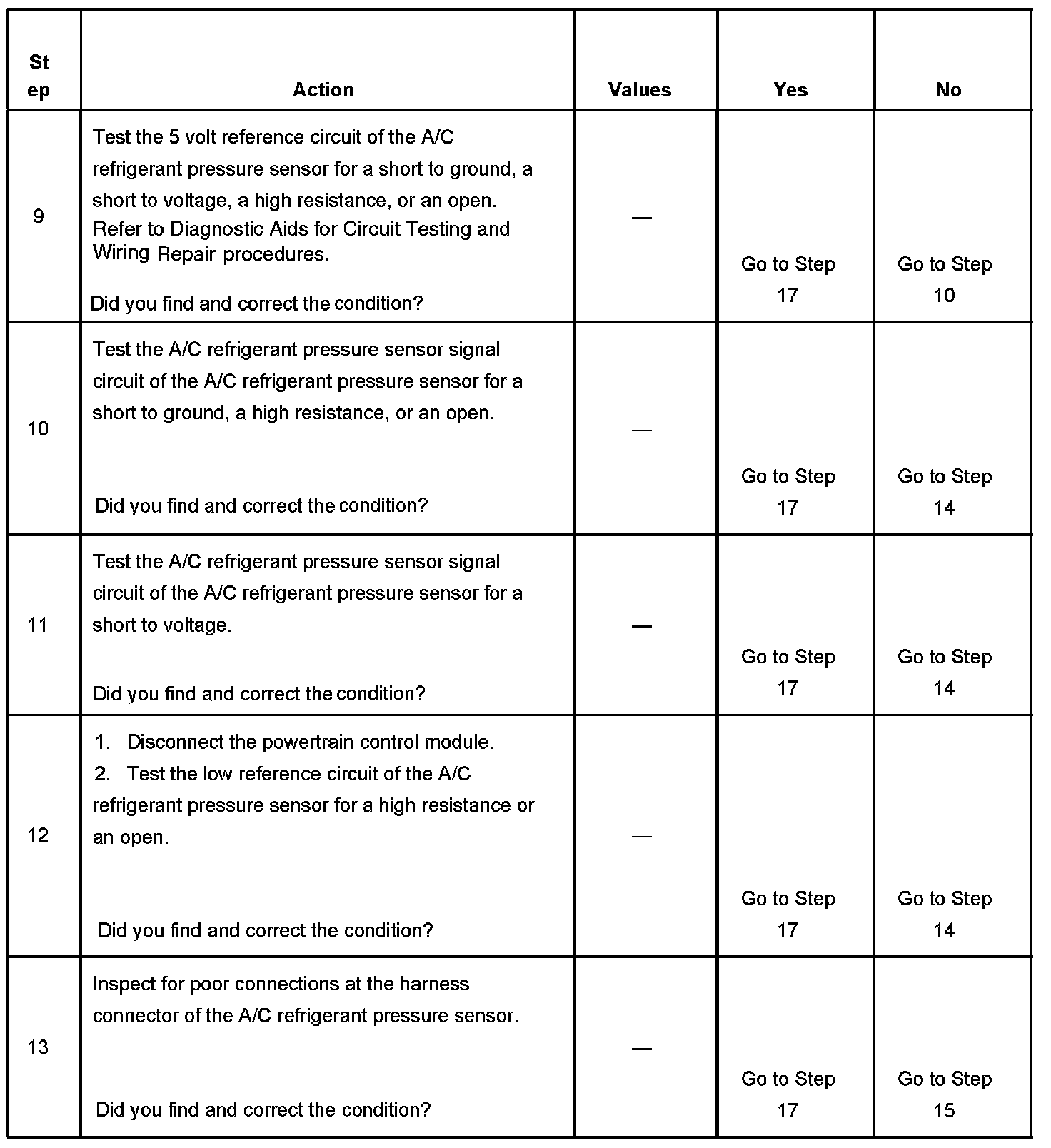 The numbers below refer to the step numbers on the diagnostic table.