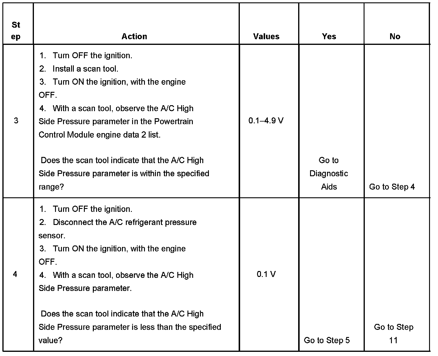 - The A/C refrigerant pressure sensor signal voltage is less than 0.1 volt.