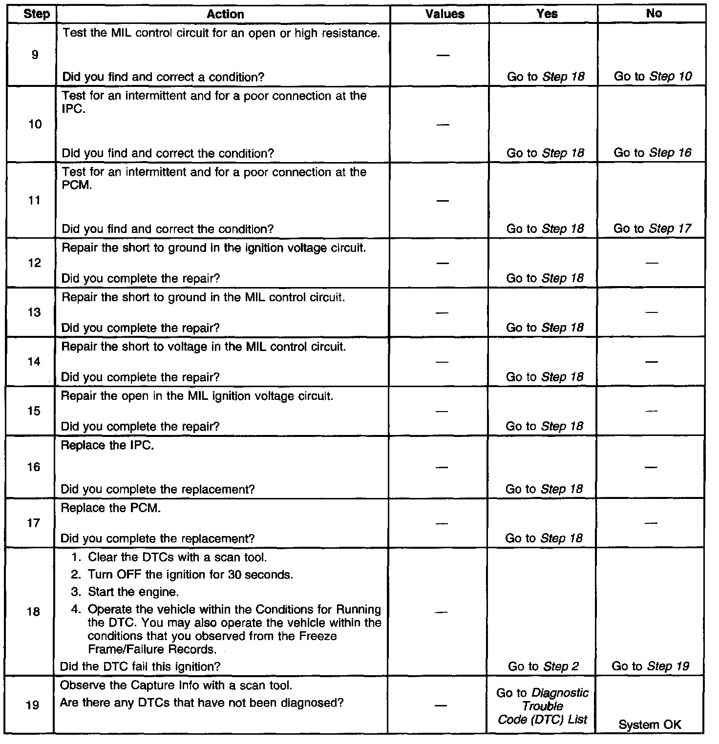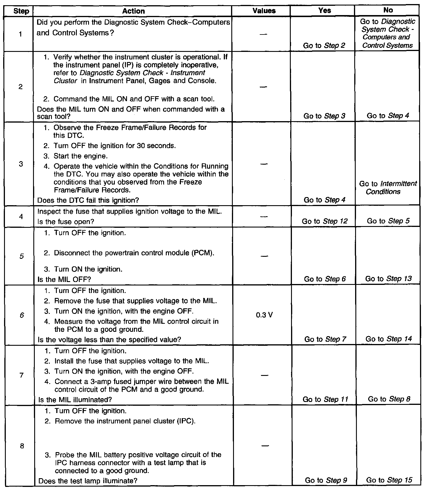 5. This step tests for a short to ground in the MIL control circuit. With the powertrain control module (PCM) disconnected and the ignition ON, the MIL should be OFF.