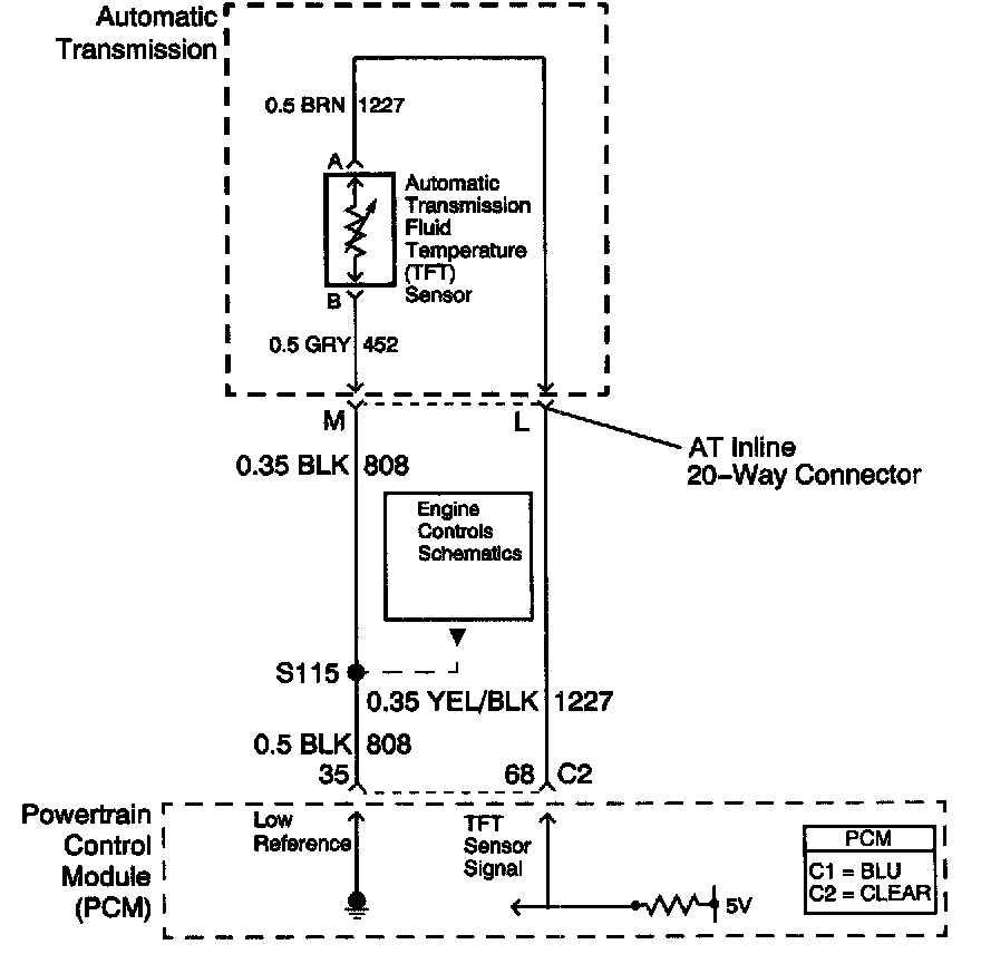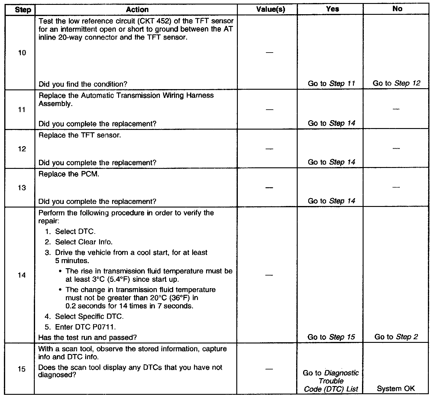 The automatic Transmission Fluid Temperature (TFT) sensor is a negative coefficient thermistor. When the transmission fluid is cold, the sensor resistance is high. As the transmission fluid warms up, the sensor resistance decreases. This diagnostic monitors the TFT sensor circuit. The circuit may be functional but not in the normal operating range. This diagnostic indicates stuck, erratic, intermittent, or skewed values, resulting in reduced system performance. The TFT sensor range is -40 to +151°C (-40 to +304°F). If the PCM detects an intermittent voltage or no voltage change in the TFT sensor circuit, then DTC P0711 sets. DTC P0711 is a type C DTC.