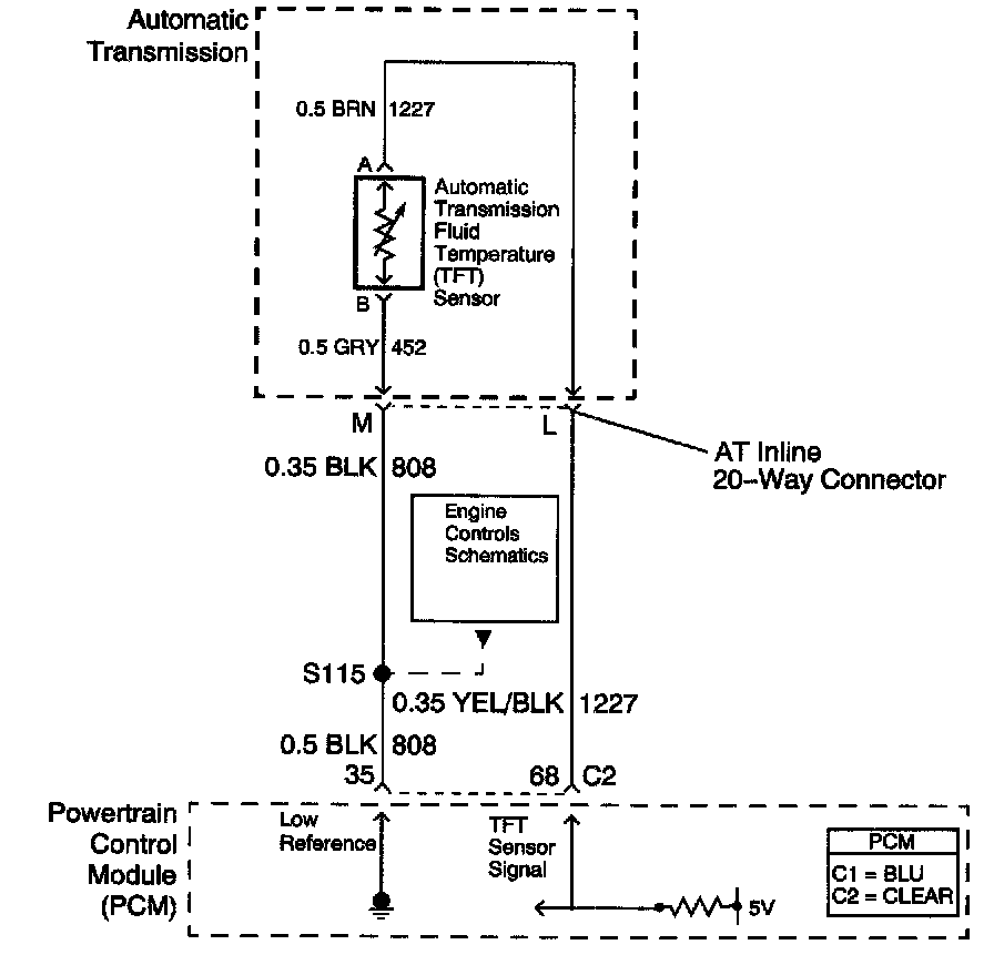 The automatic Transmission Fluid Temperature (TFT) sensor is a negative coefficient thermistor whose resistance value changes based on temperature. The PCM provides a 5 volt reference to the sensor circuit. A high fluid temperature or a short to ground on the signal circuit results in low signal voltage. The TFT sensor operating range is -40 to +151°C (-40 to +304°F).
