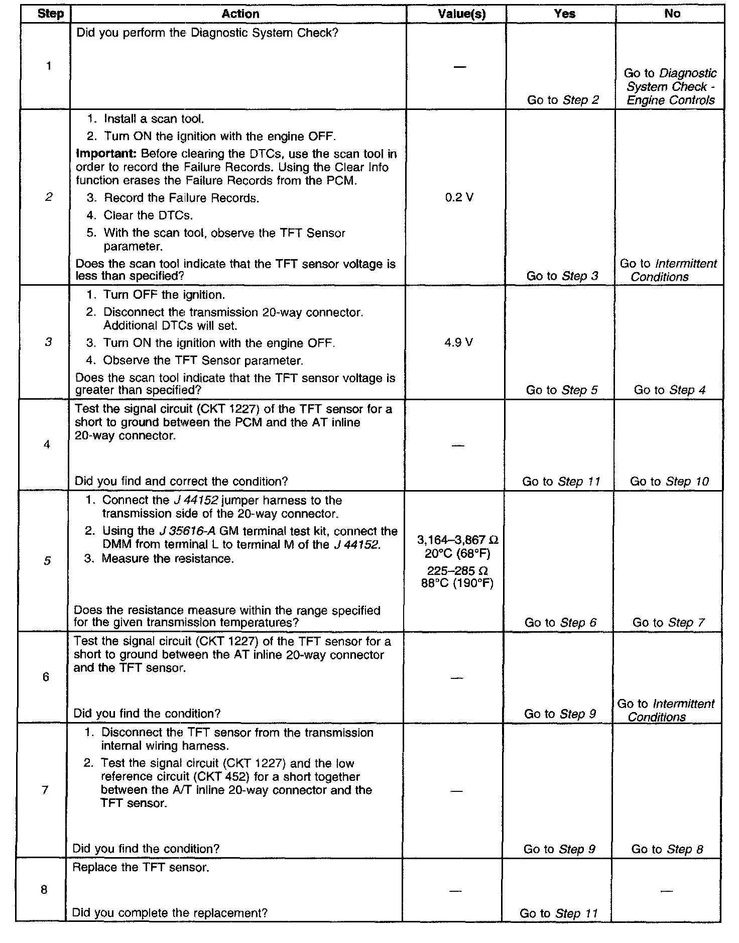 The PCM detects a TFT sensor voltage of less than 0.2 volts for 10 seconds.