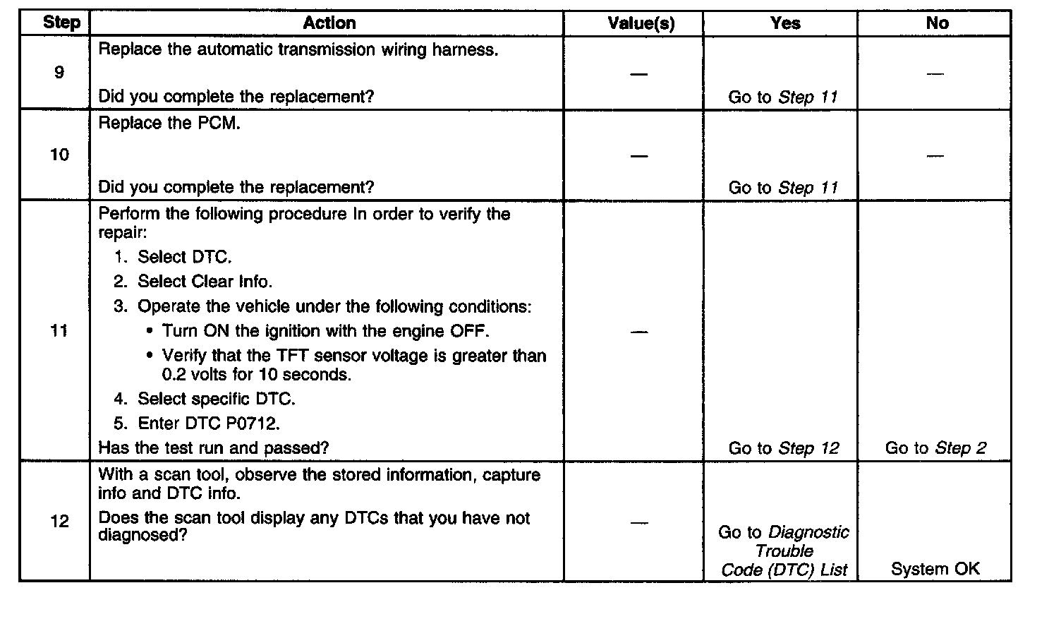 If the PCM detects a continuous short to ground in the TFT sensor signal circuit, then DTC P0712 sets. DTC P0712 is a type C DTC.