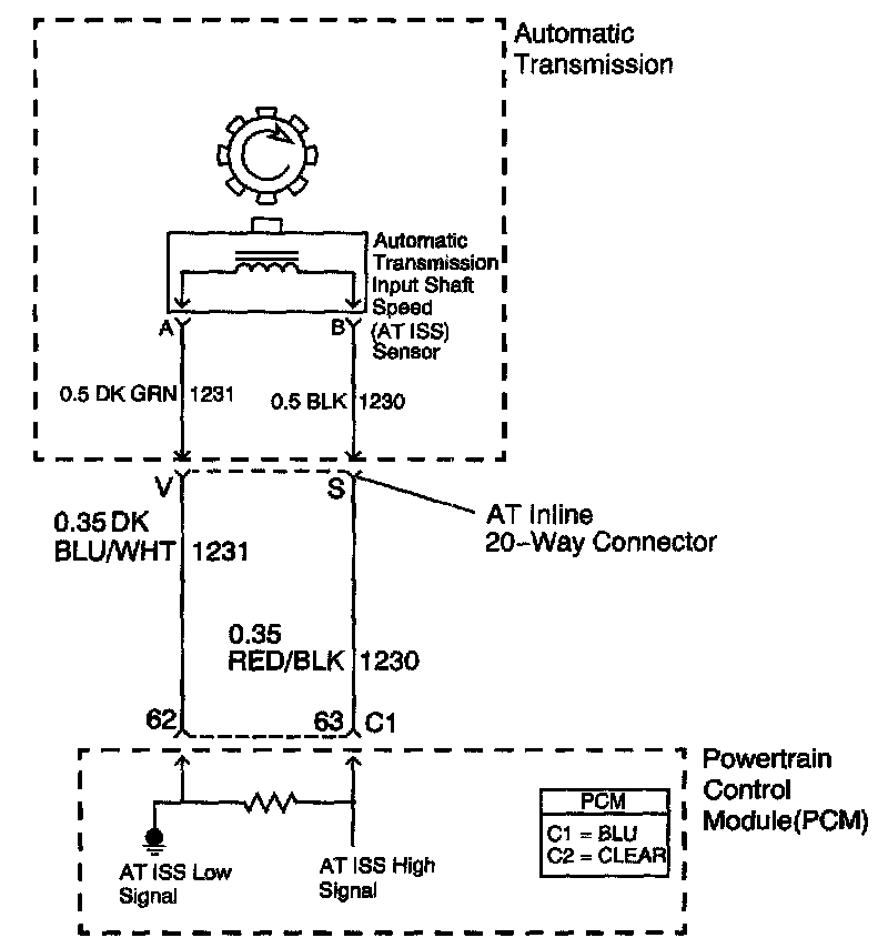 There is a fixed air gap between the sensor and the teeth on the sensor reluctor wheel. The AT ISS sensor input is used by the PCM in order to control line pressure, TCC apply and release and transmission shift patterns. This sensor is also used to calculate the appropriate gear ratios and TCC slippage.