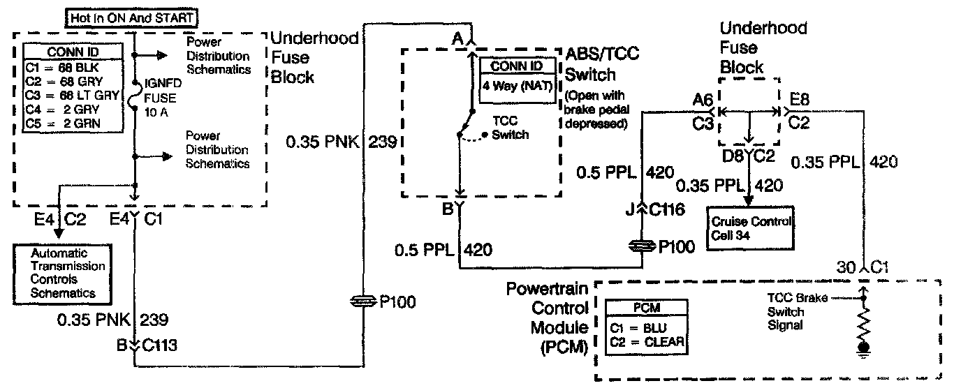 The TCC brake switch indicates brake pedal status to the PCM. The TCC brake switch indicates that the brake pedal is either applied or released. The normally-closed switch supplies battery voltage to the PCM. Applying the brake pedal opens the TCC brake switch, interrupting voltage to the PCM. When the PCM receives 0 volts at the TCC brake switch input, the PCM turns OFF the Torque Converter Clutch Pulse Width Modulation (TCC PWM) solenoid valve.