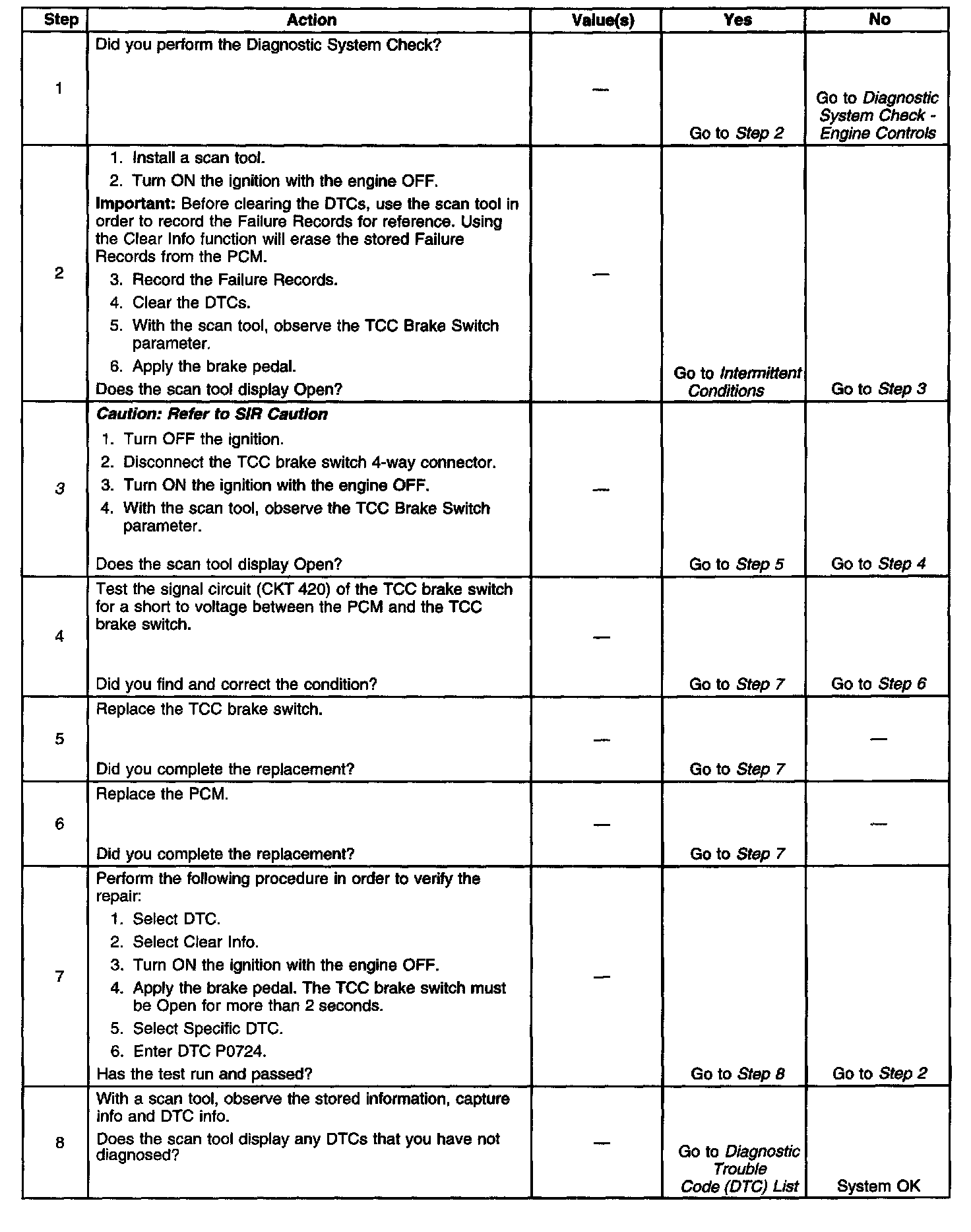 If the PCM detects a closed TCC brake switch, indicating pedal released, during a number of decelerations, then DTC P0724 sets. DTC P0724 is a type C DTC.