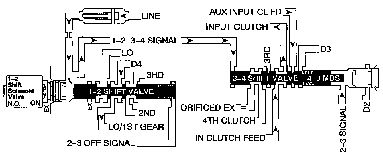 The 1-2 Shift Solenoid (1-2 SS) valve is supplied with fused ignition voltage. The ground path is controlled by the PCM. When the PCM commands the solenoid OFF, a ground path is not provided and the filtered line pressure that is fed to the solenoid is exhausted. When the PCM commands the solenoid ON, a ground path is provided and the exhaust port is blocked, stopping the exhaust of line pressure.