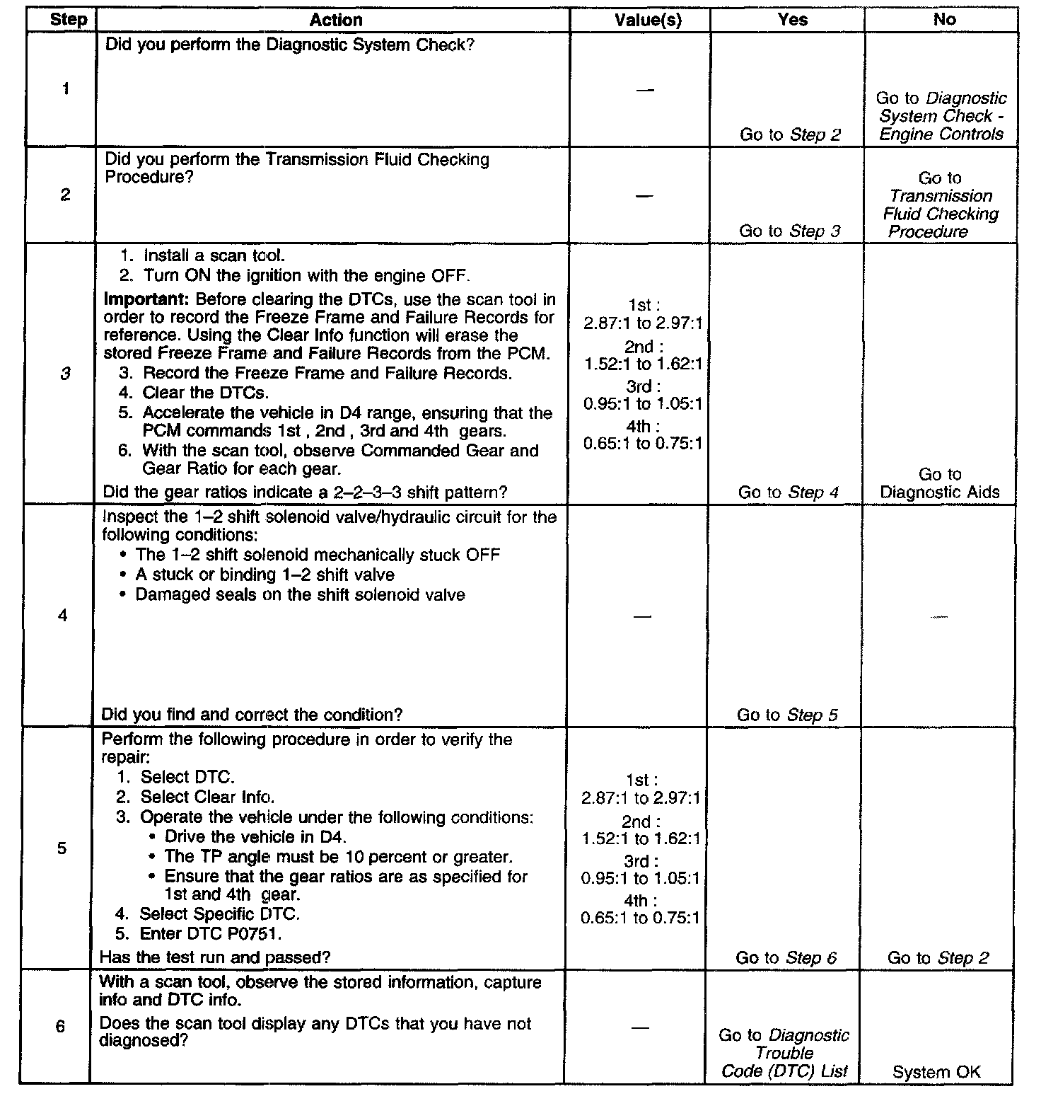 If the PCM detects a 2nd gear ratio when 1st gear is commanded and a 3rd gear ratio when 4th gear is commanded, then DTC P0751 sets. DTC P0751 is a type B DTC.