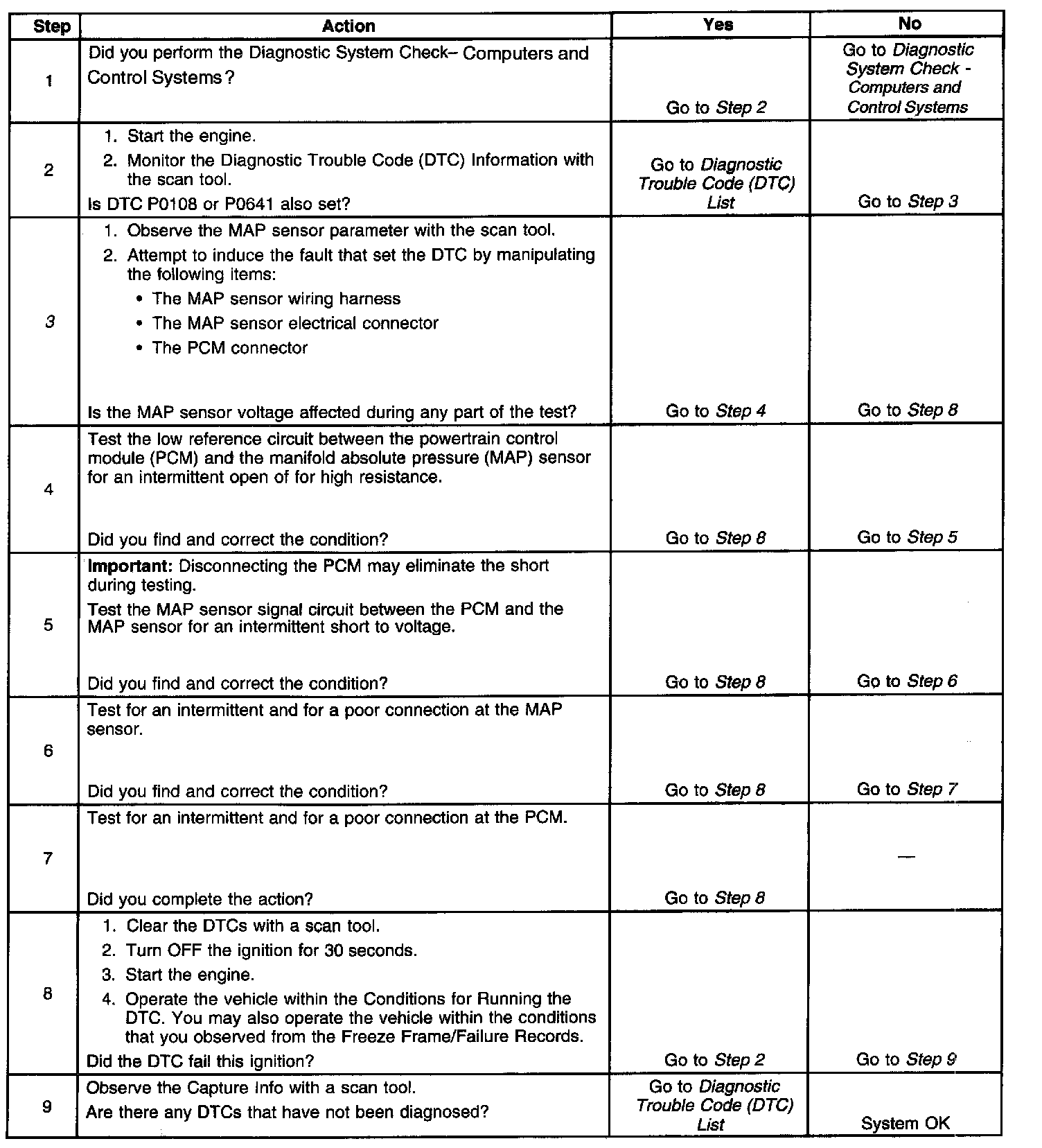 The MAP sensor responds to changes in intake manifold pressure which gives an indication of the engine load. The MAP sensor has a 5-volt reference circuit, a low reference circuit, and a signal circuit. The PCM supplies 5 voltsto the MAP sensor on the 5-volt reference circuit and provides a ground on the low reference circuit. The MAP sensor provides a signal to the PCM on the MAP sensor signal circuit which is relative to the pressure changes in the manifold. With low MAP such as during idle or deceleration, the PCM should detect a low MAP sensor signal voltage. With high MAP such as WOT, the PCM should detect a high MAP sensor signal voltage. This MAP sensor will indicate pressure between 8-208 kPa. The MAP sensor is also used in order to calculate the BARO when the ignition switch is turned ON, with the engine OFF. The PCM monitors the MAP sensor signal for voltage outside of the normal range. If the PCM detects a MAP sensor signal voltage that is intermittently high, DTC P1106 sets.