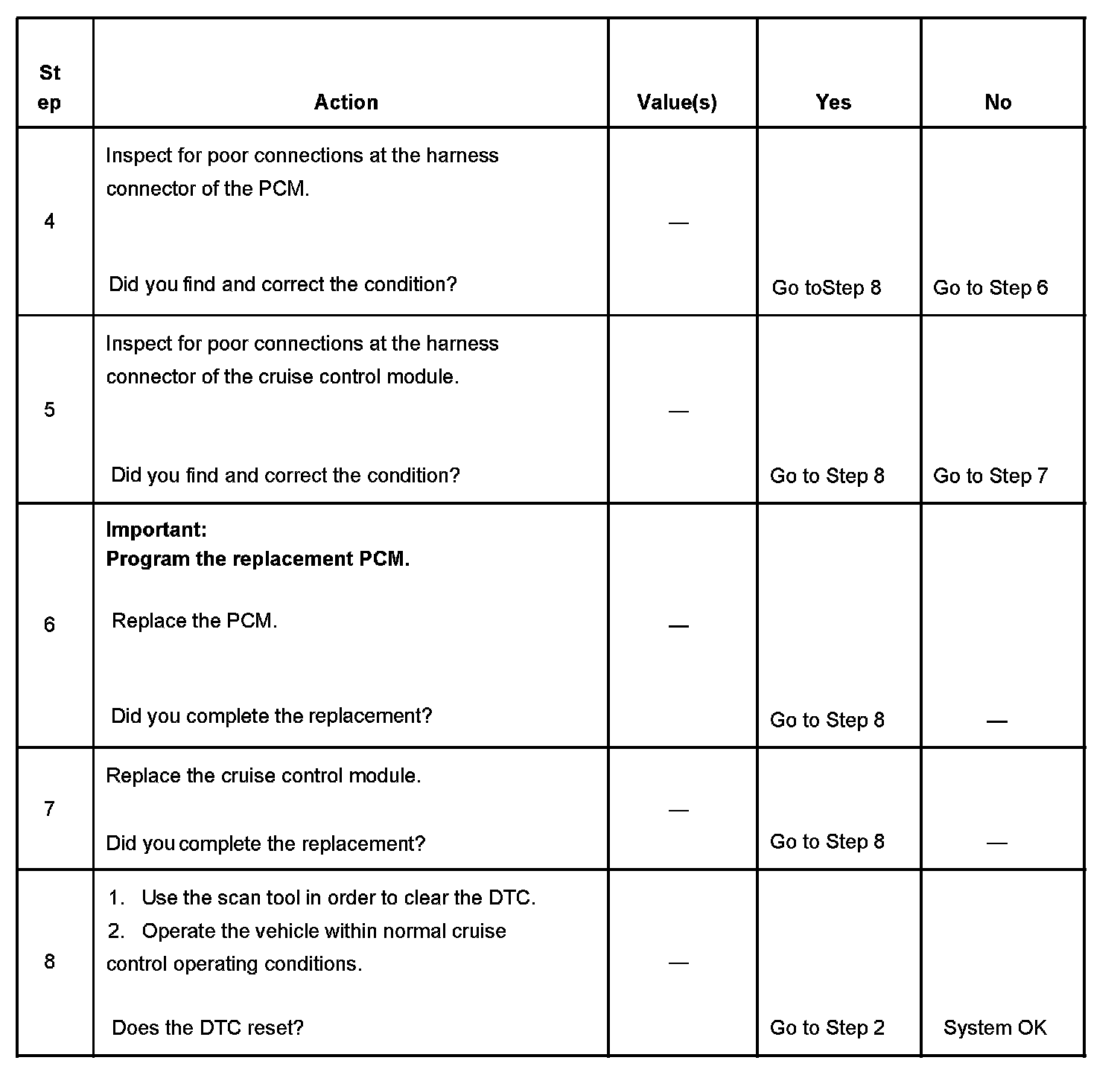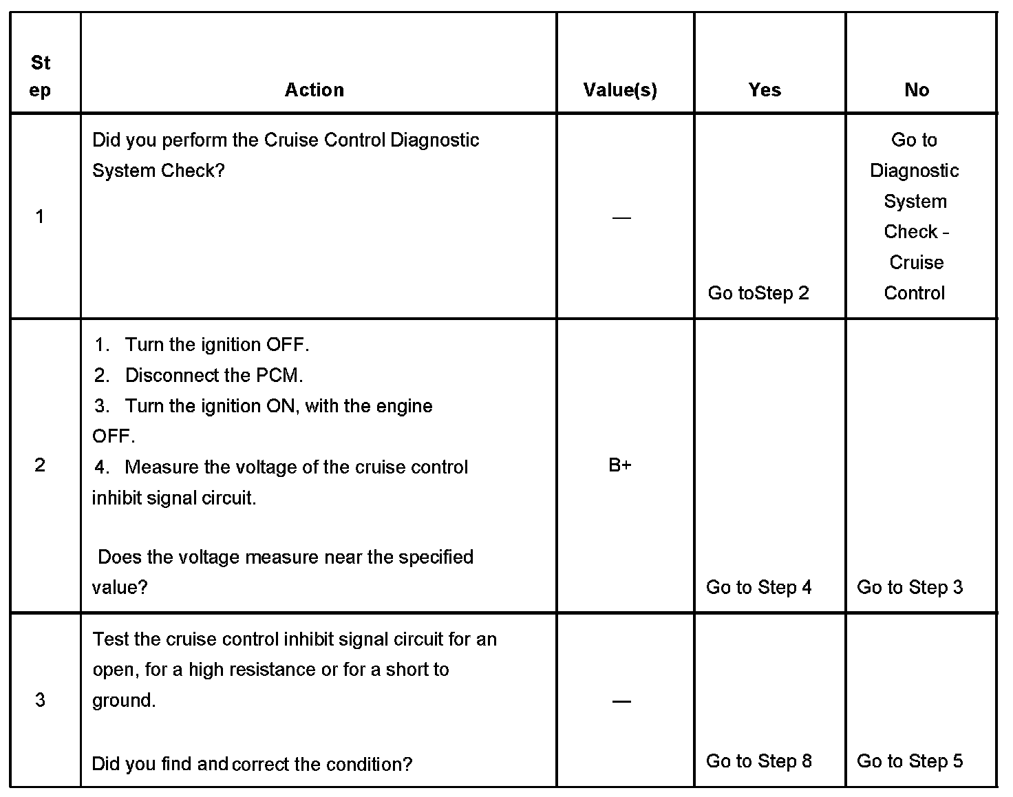 - The PCM detects that an improper voltage exists on the cruise control inhibit circuit.