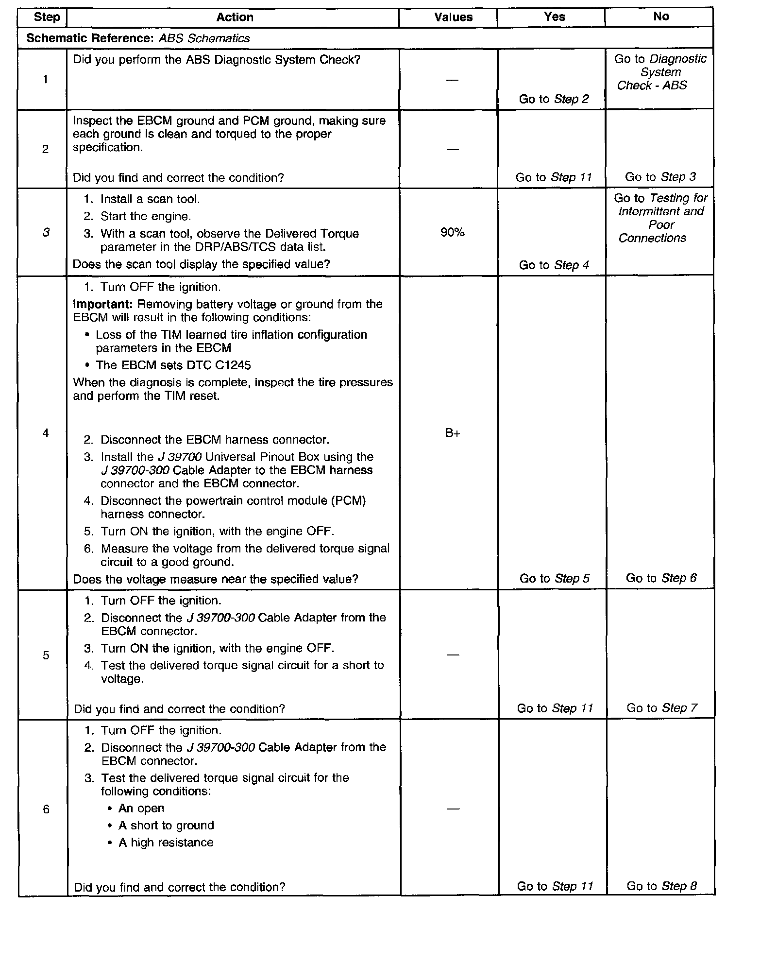The PCM sends a delivered torque message via a Pulse Width Modulated (PWM) signal to the EBCM. The duty cycle of the signal is used to determine how much engine torque the PCM is delivering. Normal values are between 10 and 90 percent duty cycle. The signal should be at low values (around 10 percent) at idle and higher values under driving conditions. The EBCM supplies a pull up voltage of 12 volts that the PCM switches to ground to create the signal.